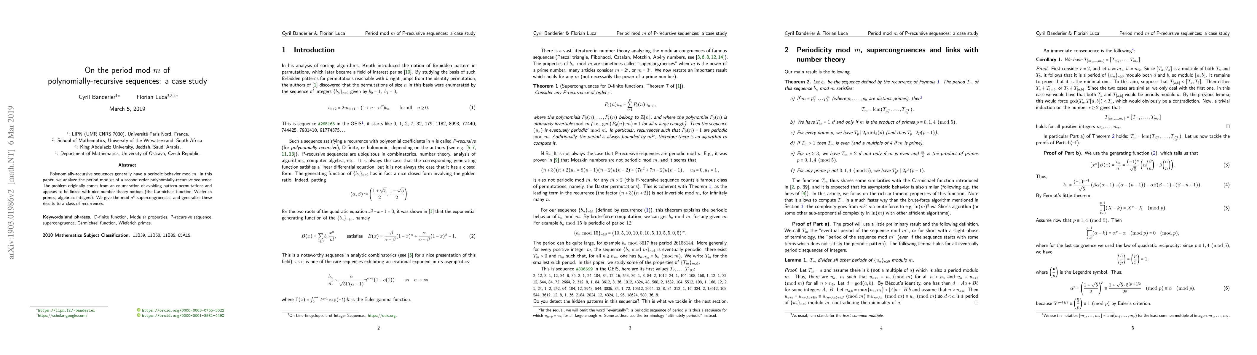 Polynomially-recursive sequences generally have a periodic behavior mod $m$. In this paper, we analyze the period mod $m$ of a second order polynomially-recursive sequence. The problem originally comes from an enumeration of avoiding pattern permutations and appears to be linked with nice number theory notions (the Carmichael function, Wieferich primes, algebraic integers). We give the mod $a^k$ supercongruences, and generalize these results to a class of recurrences.