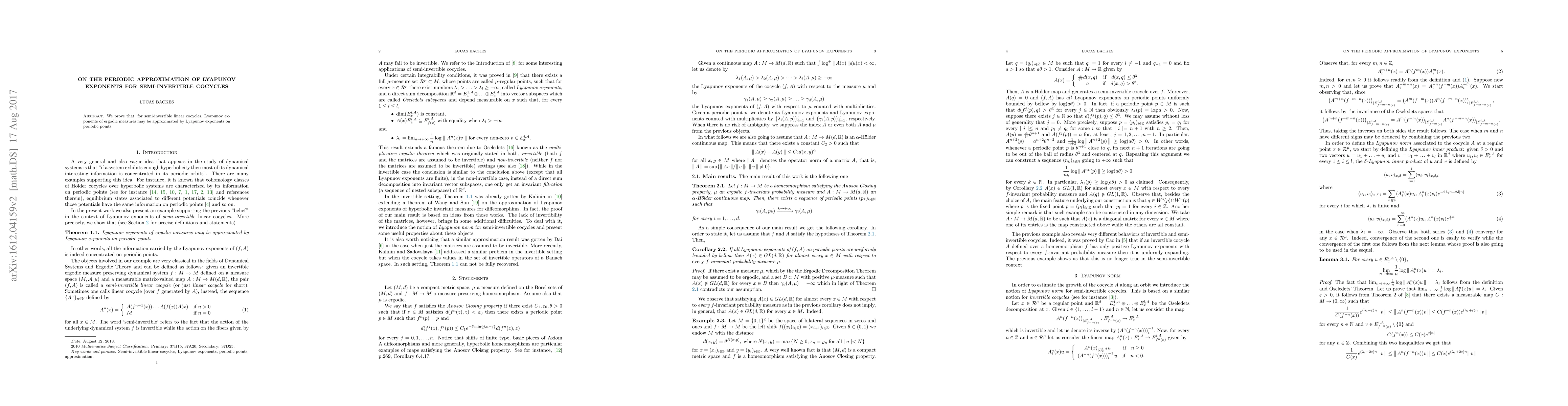 Summary: This paper demonstrates that Lyapunov exponents for ergodic measures of semi-invertible linear cocycles can be accurately approximated by those computed on periodic points. This provides a useful method for understanding the dynamics of such systems.