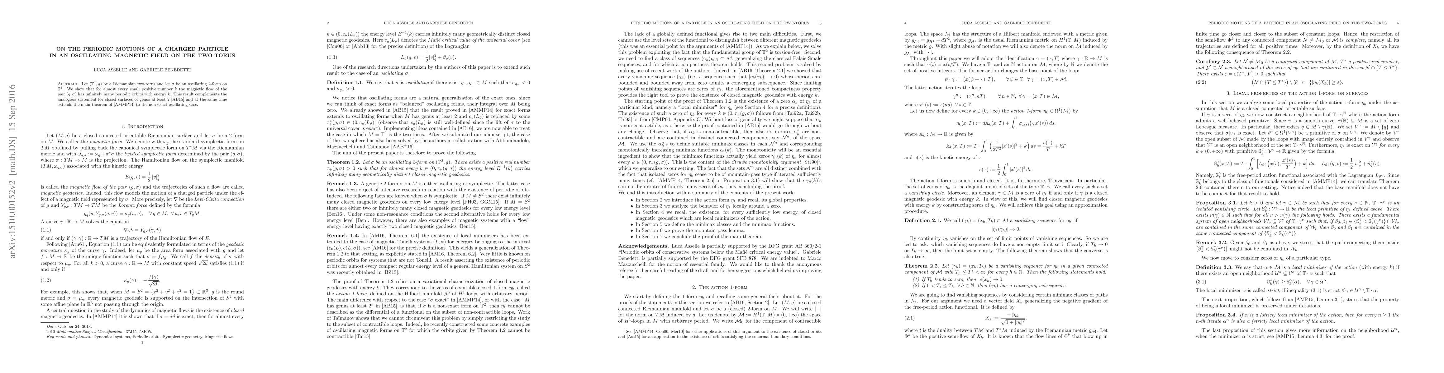 This paper demonstrates that on a Riemannian two-torus, the magnetic flow associated with a small oscillating magnetic field has infinitely many periodic orbits for almost every small positive energy value. This extends previous results for closed surfaces of higher genus to the non-exact oscillating case.
