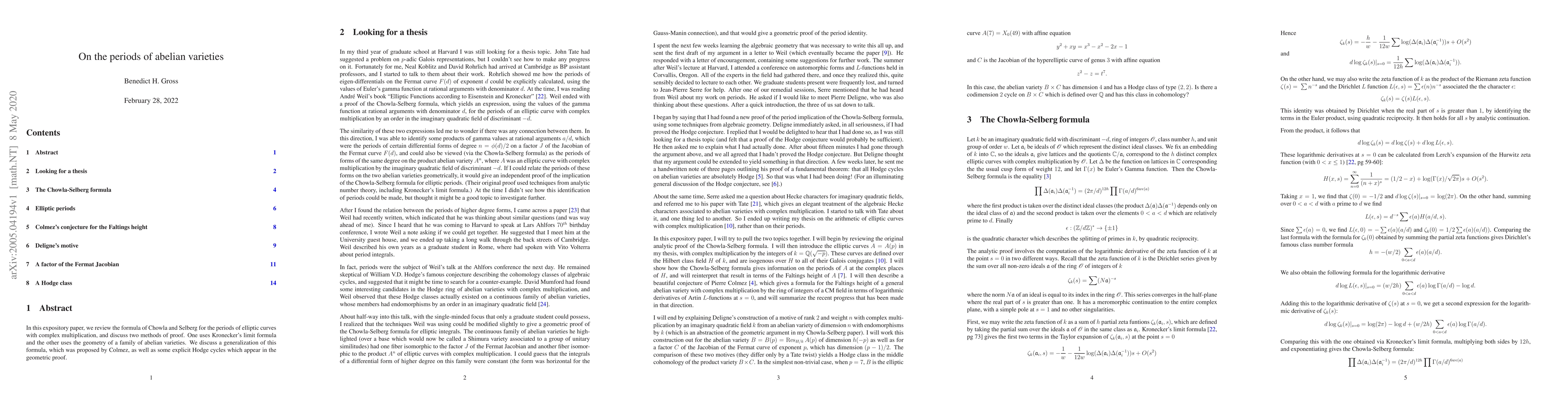 This paper reviews the Chowla-Selberg formula for elliptic curves with complex multiplication, examining two proof methods: one via Kronecker's limit formula and another using the geometry of abelian varieties. It also discusses Colmez's generalization and explicit Hodge cycles relevant to the geometric proof.