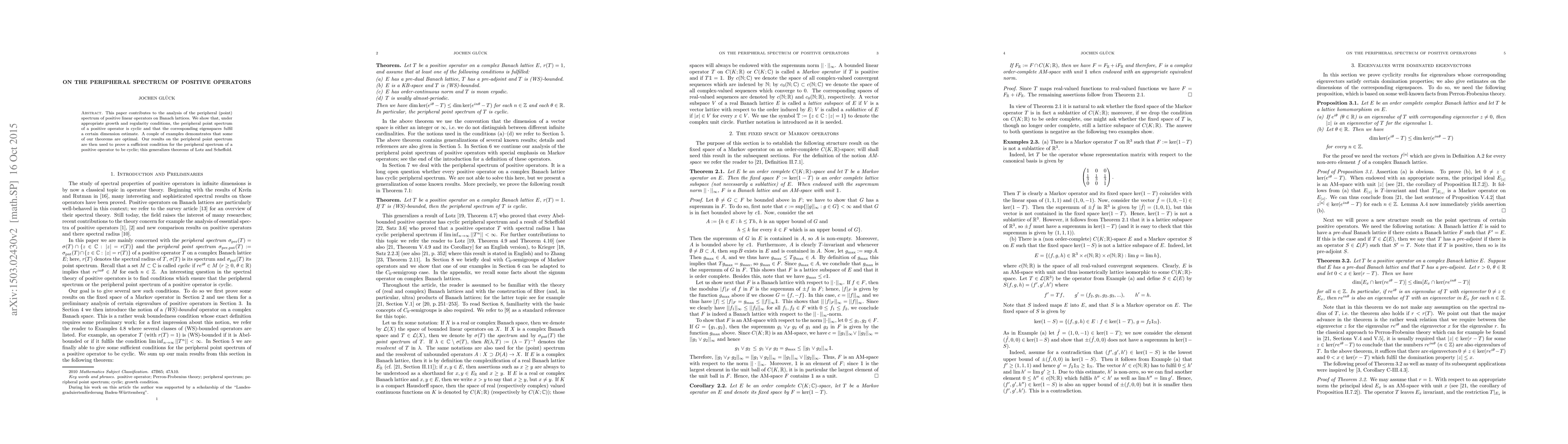 This paper analyzes the peripheral spectrum of positive linear operators on Banach lattices, proving that under specific growth and regularity conditions, the peripheral point spectrum is cyclic and eigenspaces meet a dimension estimate. It also generalizes previous theorems on the peripheral spectrum.