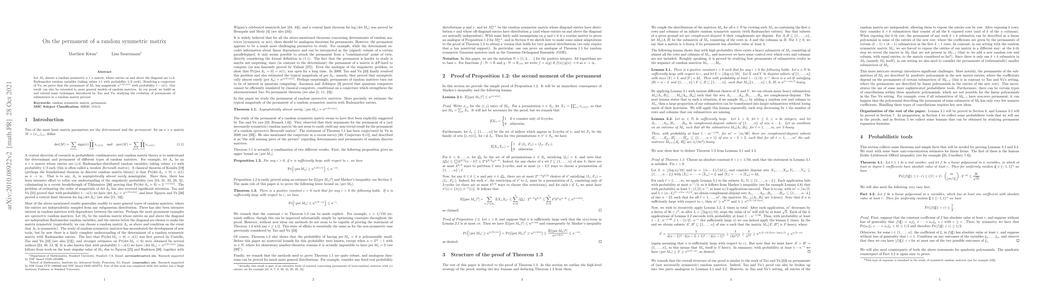 This research proves that the permanent of a random symmetric n×n matrix, with Rademacher entries, has a magnitude of n^(n/2+o(n)) with high probability. The result also applies to broader random matrix models.