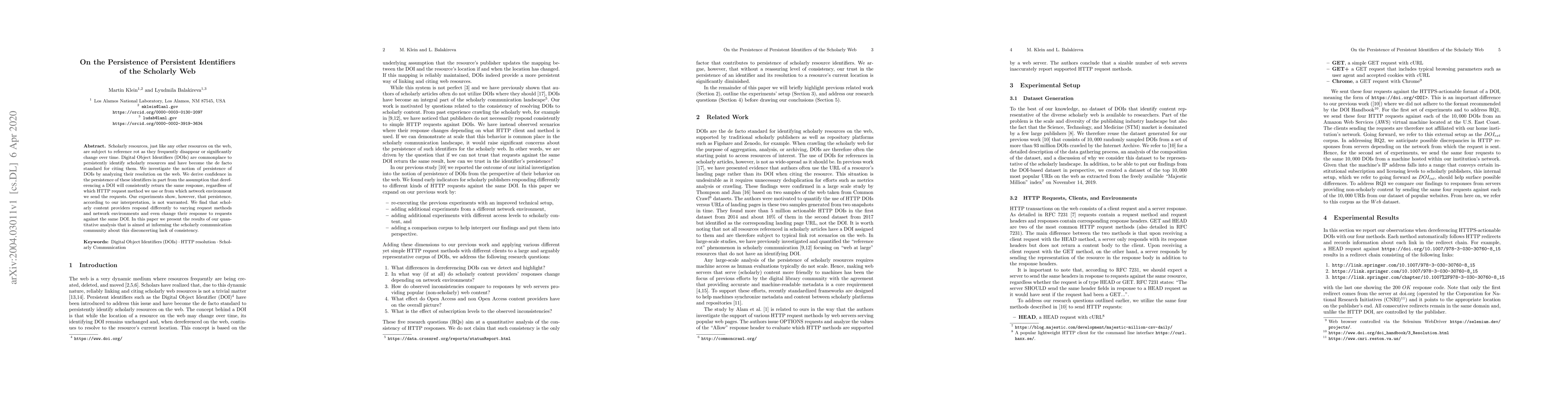 This paper investigates the persistence of DOIs in scholarly resources, finding that DOIs do not consistently return the same response across different HTTP request methods and network environments, challenging the reliability of these identifiers for long-term scholarly communication. The study highlights the need for improved consistency in digital identifiers to prevent reference rot.