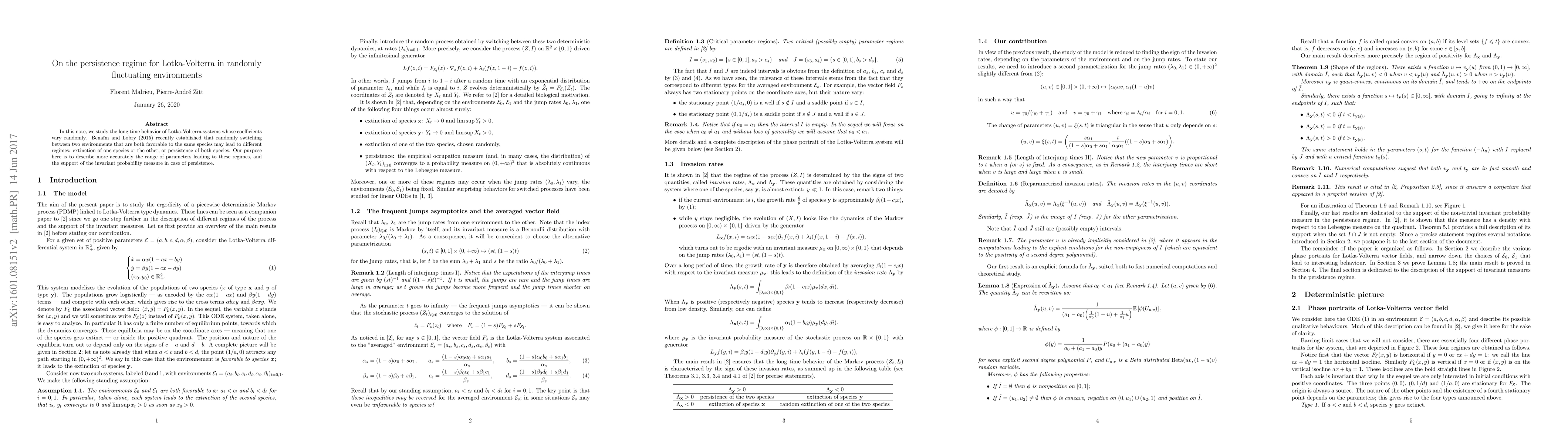 This paper investigates the long-term behavior of Lotka-Volterra systems with randomly fluctuating coefficients, focusing on the persistence regimes and the conditions under which species may coexist or face extinction. It aims to refine the parameter ranges and the support of the invariant probability measure for species persistence.