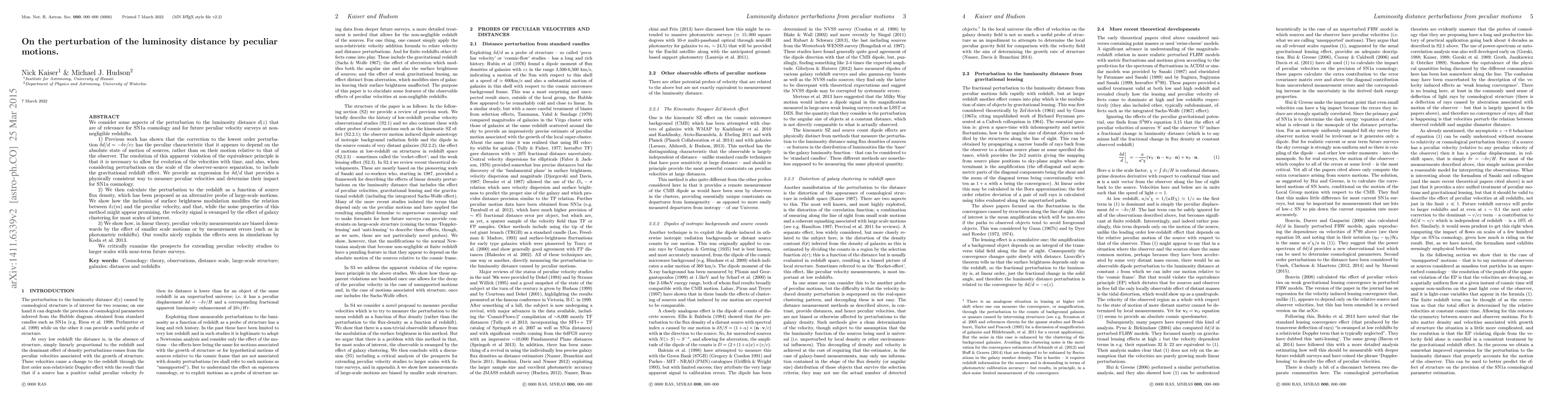 This paper investigates the perturbation of luminosity distance due to peculiar motions, emphasizing its implications for SN1a cosmology and future velocity surveys. It provides a consistent expression for measuring peculiar velocities and discusses the effects of gravitational redshift and galaxy clustering on these measurements.