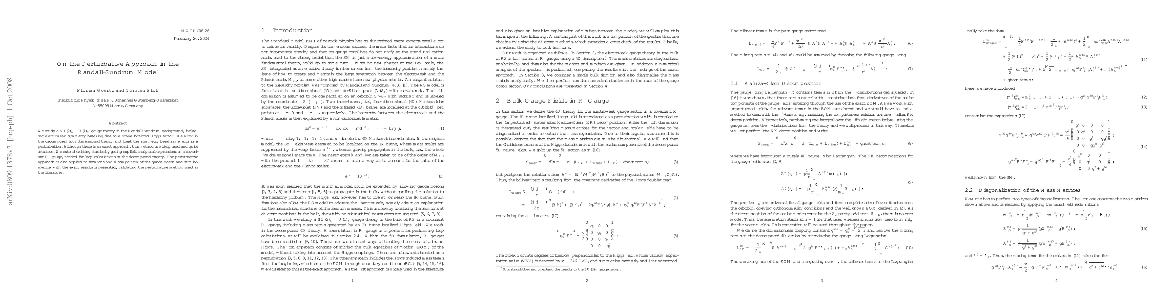 This paper explores the perturbative approach in the Randall-Sundrum model, focusing on a SU(2)_L x U(1)_Y gauge theory with electroweak symmetry breaking from a brane-localized Higgs sector. It provides explicit analytical expressions in a covariant R_xi gauge for loop calculations, comparing gauge boson and fermion spectra with exact results to validate the perturbative method.