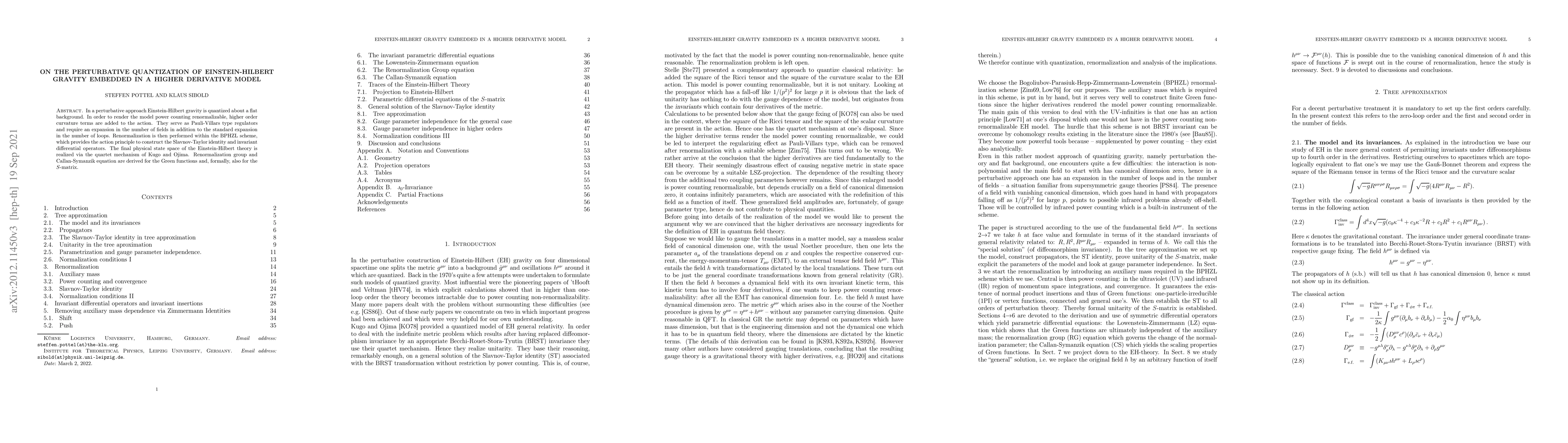 In a perturbative approach Einstein-Hilbert gravity is quantized about a flat background. In order to render the model power counting renormalizable, higher order curvature terms are added to the action. They serve as Pauli-Villars type regulators and require an expansion in the number of fields in addition to the standard expansion in the number of loops. Renormalization is then performed within the BPHZL scheme, which provides the action principle to construct the Slavnov-Taylor identity and invariant differential operators. The final physical state space of the Einstein-Hilbert theory is realized via the quartet mechanism of Kugo and Ojima. Renormalization group and Callan-Symanzik equation are derived for the Green functions and, formally, also for the $S$-matrix.