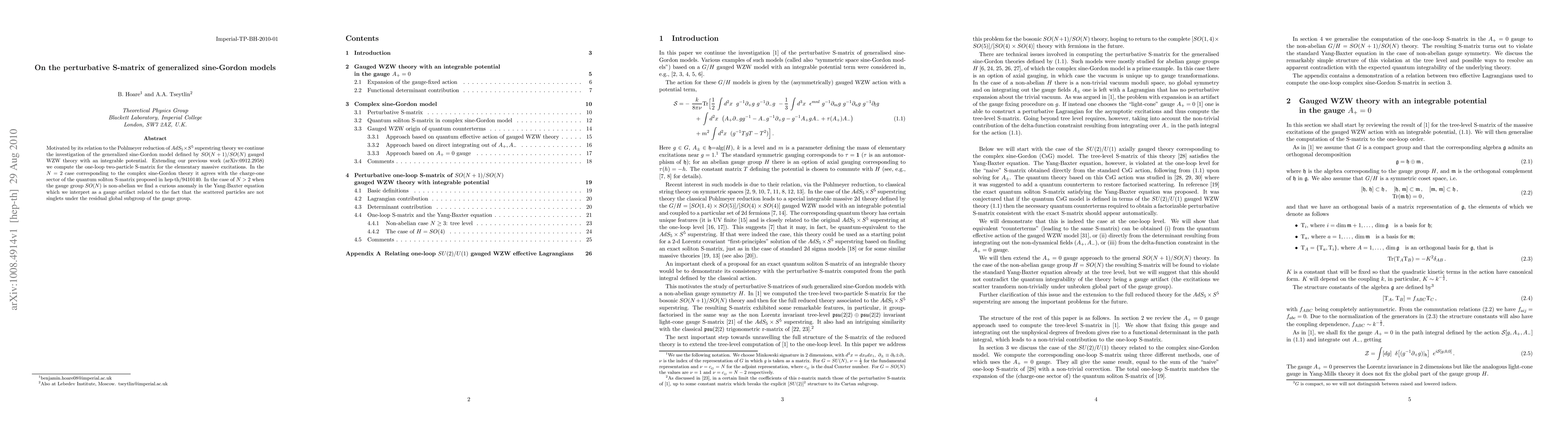 Motivated by its relation to the Pohlmeyer reduction of AdS_5 x S^5 superstring theory we continue the investigation of the generalized sine-Gordon model defined by SO(N+1)/SO(N) gauged WZW theory with an integrable potential. Extending our previous work (arXiv:0912.2958) we compute the one-loop two-particle S-matrix for the elementary massive excitations. In the N = 2 case corresponding to the complex sine-Gordon theory it agrees with the charge-one sector of the quantum soliton S-matrix proposed in hep-th/9410140. In the case of N > 2 when the gauge group SO(N) is non-abelian we find a curious anomaly in the Yang-Baxter equation which we interpret as a gauge artifact related to the fact that the scattered particles are not singlets under the residual global subgroup of the gauge group.