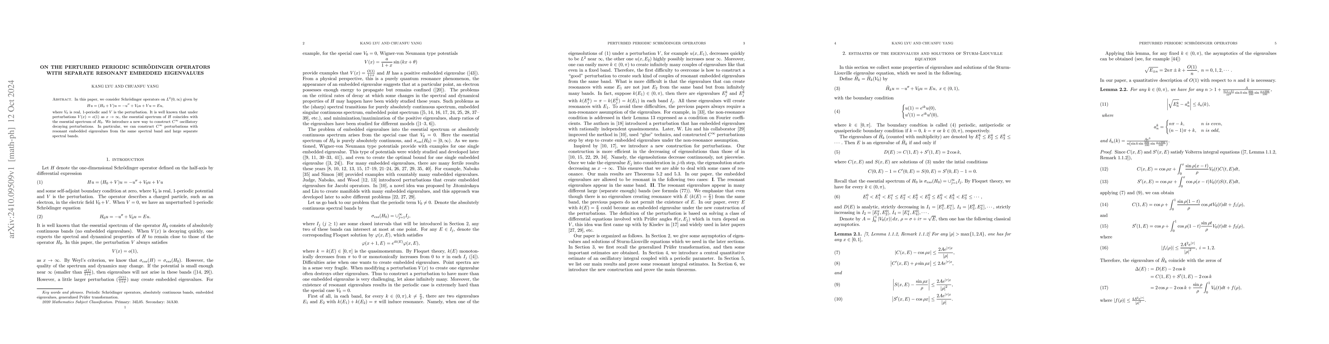 This paper investigates perturbed periodic Schrödinger operators on $L^2(0,\infty)$ with $C^\infty$ oscillatory decaying perturbations, introducing a new method to construct perturbations that yield resonant embedded eigenvalues in separate spectral bands. It confirms that under small perturbations, the essential spectrum remains unchanged.