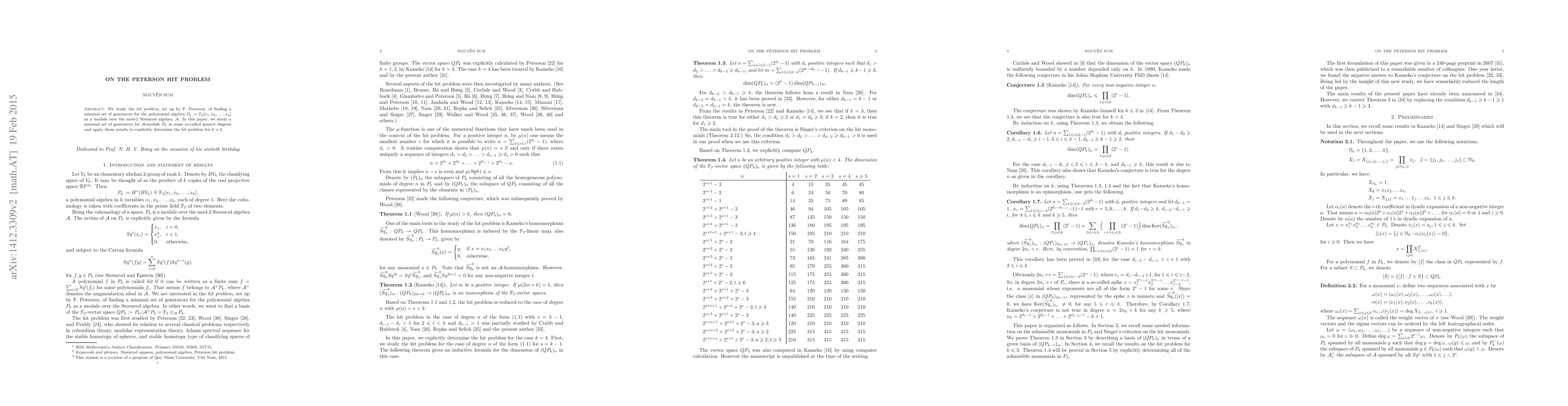 We study the hit problem, set up by F. Peterson, of finding a minimal set of generators for the polynomial algebra $P_k := \mathbb F_2[x_1,x_2,...,x_k]$ as a module over the mod-2 Steenrod algebra, $\mathcal{A}$. In this paper, we study a minimal set of generators for $\mathcal A$-module $P_k$ in some so-call generic degrees and apply these results to explicitly determine the hit problem for $k=4$.