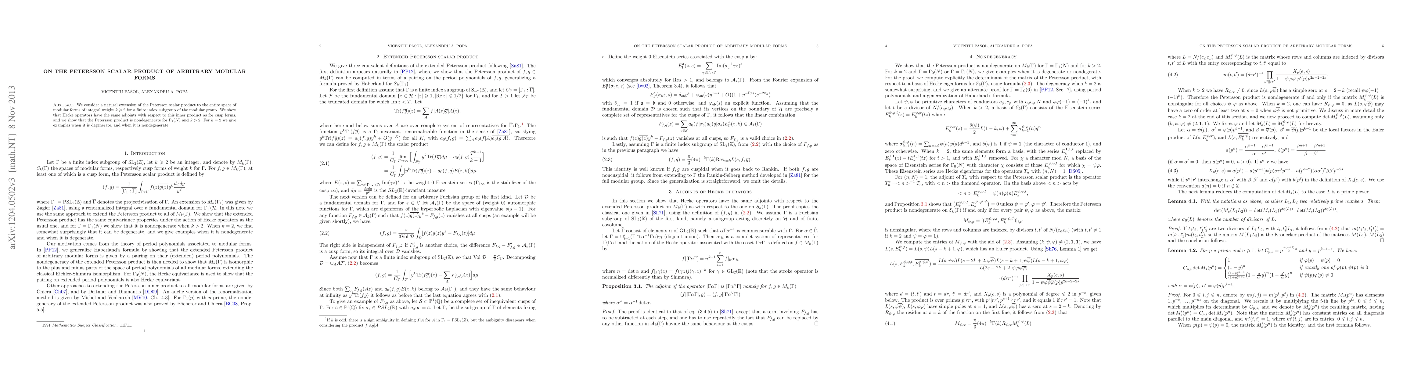 This paper extends the Petersson scalar product to all modular forms of weight $k\ge 2$ for finite index subgroups of the modular group, demonstrating that Hecke operators retain their adjoint properties. It proves nondegeneracy for $k>2$ and provides examples for $k=2$ showing both cases of degeneracy and nondegeneracy.