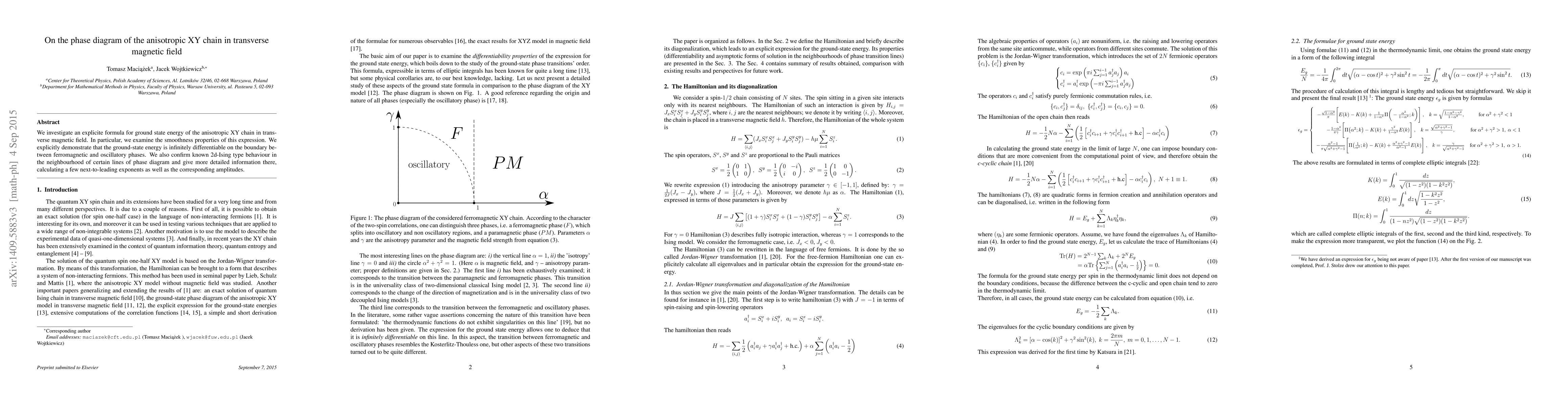 Researchers investigated the ground state energy of an anisotropic XY chain in a transverse magnetic field, confirming known 2D-Ising behavior and providing detailed information on phase transitions and smoothness properties.
