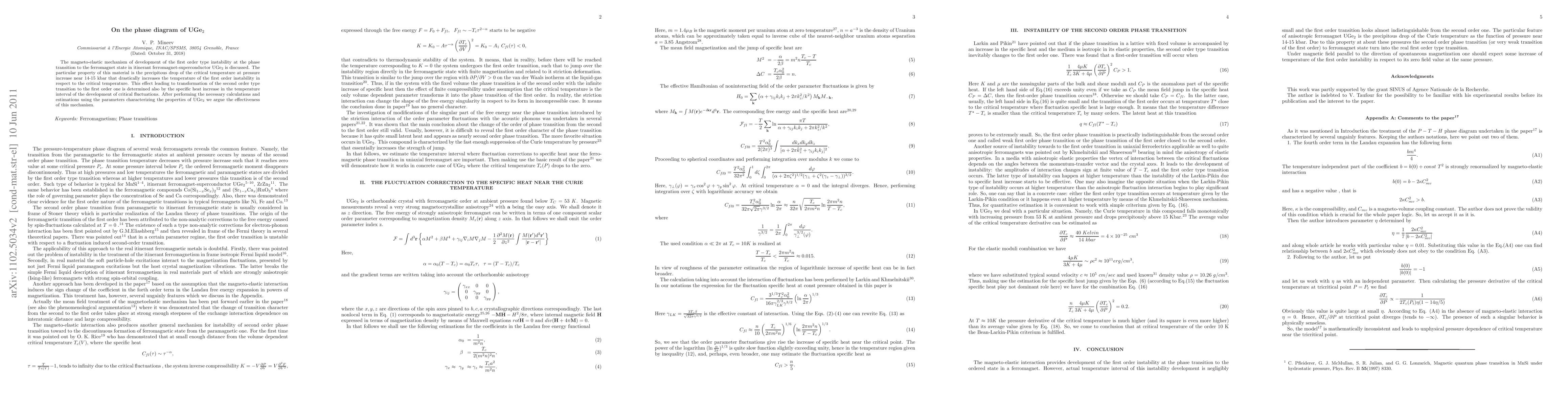 The magneto-elastic mechanism of development of the first order type instability at the phase transition to the ferromagnet state in itinerant ferromagnet-superconductor UGe2 is discussed. The particular property of this material is the precipitous drop of the critical temperature at pressure increase near 14-15 kbar that drastically increases the temperature of the first order instability in respect to the critical temperature. This effect leading to transformation of the second order type transition to the first order one is determined also by the specific heat increase in the temperature interval of the development of critical fluctuations. After performing the necessary calculations and estimations using the parameters characterizing the properties of UGe2 we argue the effectiveness of this mechanism.