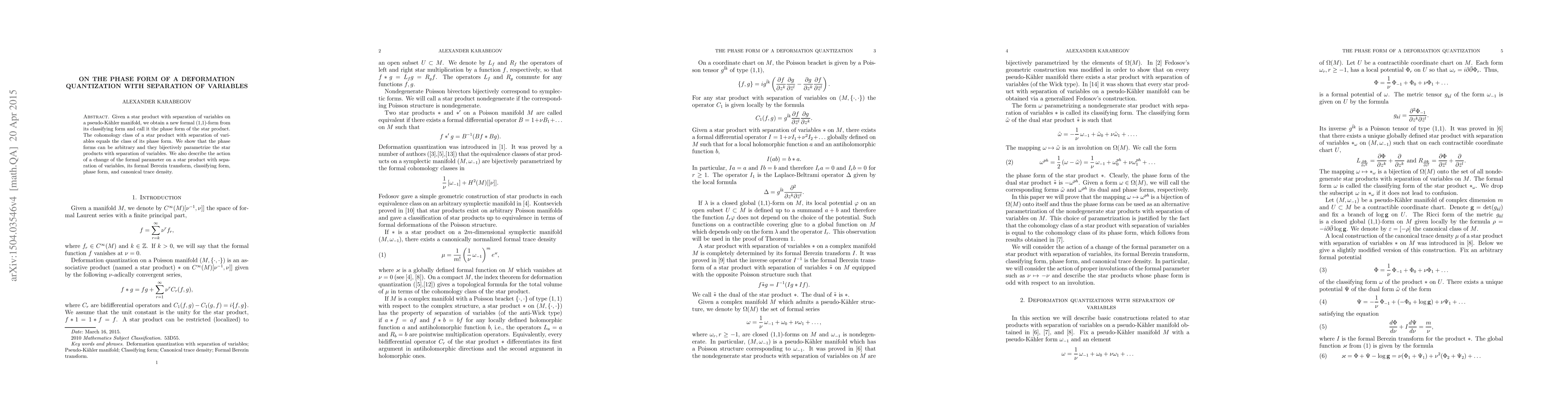 This paper introduces the concept of a phase form for star products with separation of variables on pseudo-Kaehler manifolds, demonstrating that these phase forms bijectively parametrize such star products. It also explores the effects of changes in formal parameters on these star products and their associated mathematical objects.