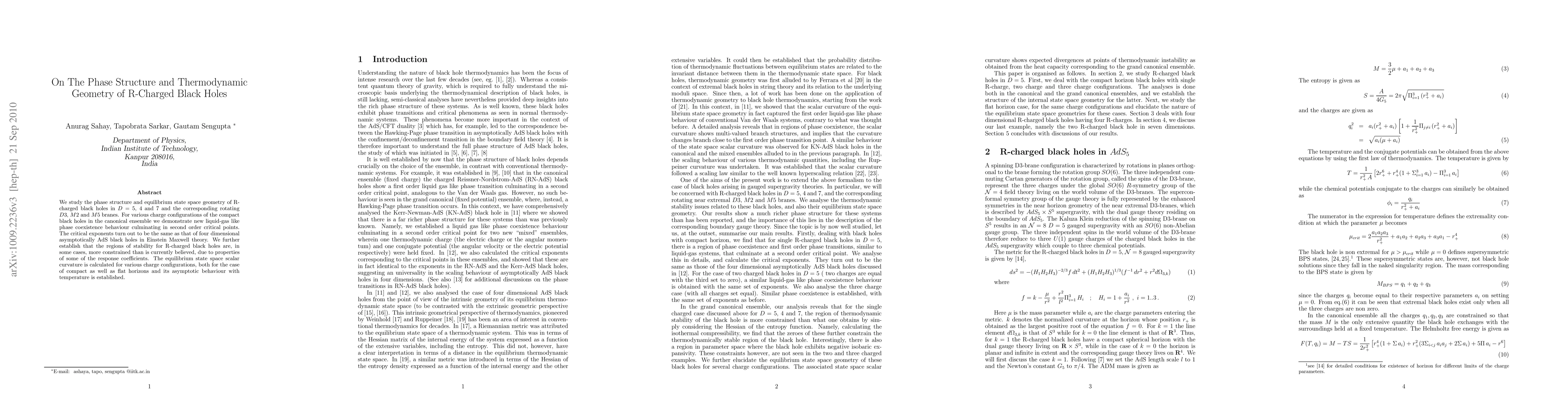 We study the phase structure and equilibrium state space geometry of R-charged black holes in $D = 5$, 4 and 7 and the corresponding rotating $D3$, $M2$ and $M5$ branes. For various charge configurations of the compact black holes in the canonical ensemble we demonstrate new liquid-gas like phase coexistence behaviour culminating in second order critical points. The critical exponents turn out to be the same as that of four dimensional asymptotically AdS black holes in Einstein Maxwell theory. We further establish that the regions of stability for R-charged black holes are, in some cases, more constrained than is currently believed, due to properties of some of the response coefficients. The equilibrium state space scalar curvature is calculated for various charge configurations, both for the case of compact as well as flat horizons and its asymptotic behaviour with temperature is established.