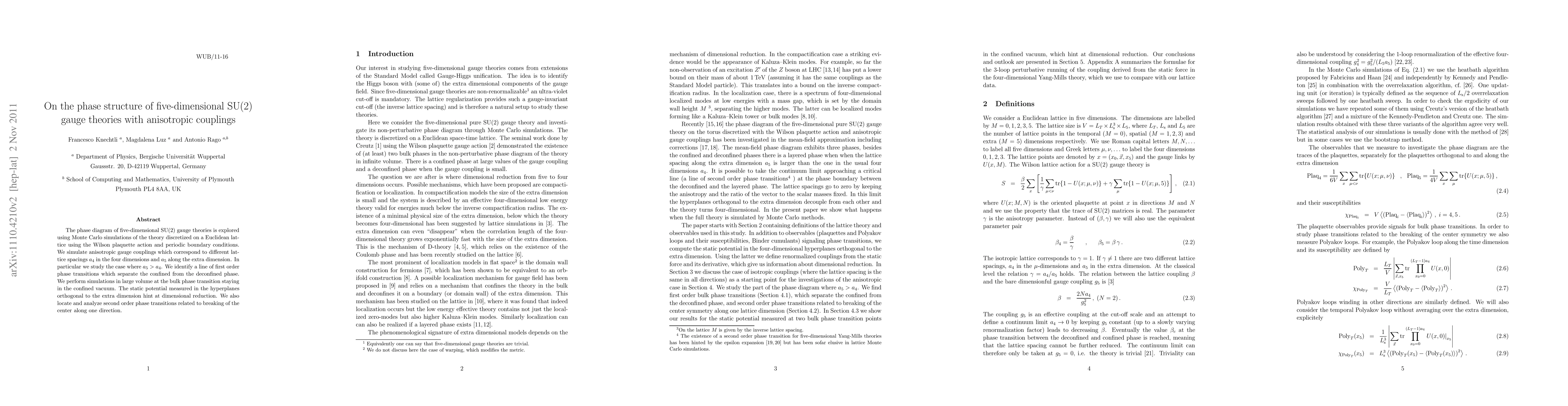 This paper investigates the phase diagram of five-dimensional SU(2) gauge theories using Monte Carlo simulations with anisotropic couplings. The study identifies a line of first-order phase transitions separating confined and deconfined phases, and hints at dimensional reduction via the static potential.