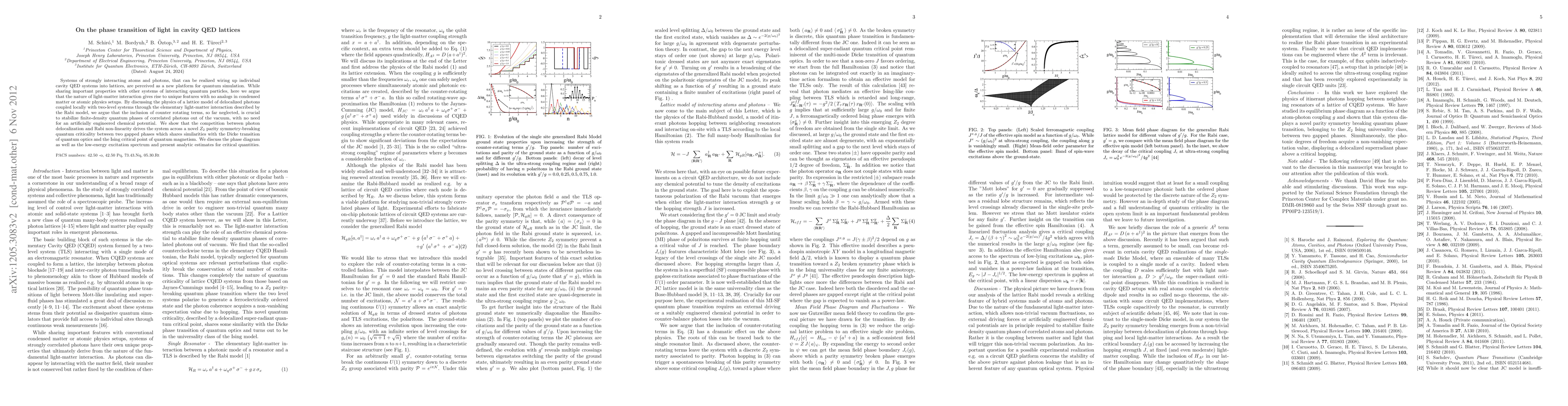 Systems of strongly interacting atoms and photons, that can be realized wiring up individual cavity QED systems into lattices, are perceived as a new platform for quantum simulation. While sharing important properties with other systems of interacting quantum particles here we argue that the nature of light-matter interaction gives rise to unique features with no analogs in condensed matter or atomic physics setups. By discussing the physics of a lattice model of delocalized photons coupled locally with two-level systems through the elementary light-matter interaction described by the Rabi model, we argue that the inclusion of counter rotating terms, so far neglected, is crucial to stabilize finite-density quantum phases of correlated photons out of the vacuum, with no need for an artificially engineered chemical potential. We show that the competition between photon delocalization and Rabi non-linearity drives the system across a novel $Z_2$ parity symmetry-breaking quantum criticality between two gapped phases which shares similarities with the Dicke transition of quantum optics and the Ising critical point of quantum magnetism. We discuss the phase diagram as well as the low-energy excitation spectrum and present analytic estimates for critical quantities.