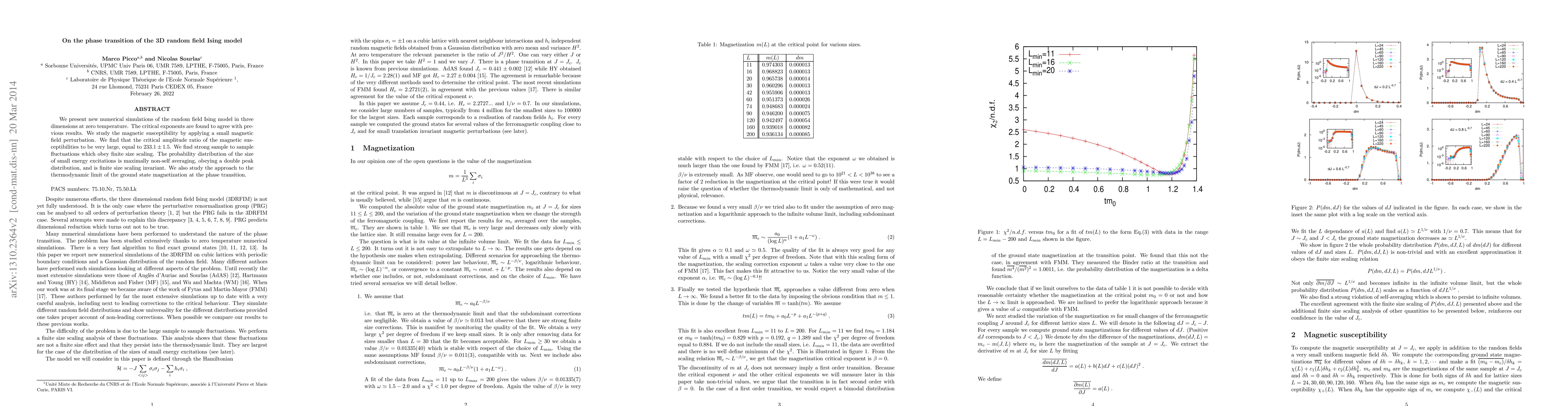 We present numerical simulations of the random field Ising model in three dimensions at zero temperature. The critical exponents are found to agree with previous results. We study the magnetic susceptibility by applying a small magnetic field perturbation. We find that the critical amplitude ratio of the magnetic susceptibilities to be very large, equal to 233.1 \pm 1.5. We find strong sample to sample fluctuations which obey finite size scaling. The probability distribution of the size of small energy excitations is maximally non-self averaging, obeying a double peak distribution, and is finite size scaling invariant. We also study the approach to the thermodynamic limit of the ground state magnetization at the phase transition.
