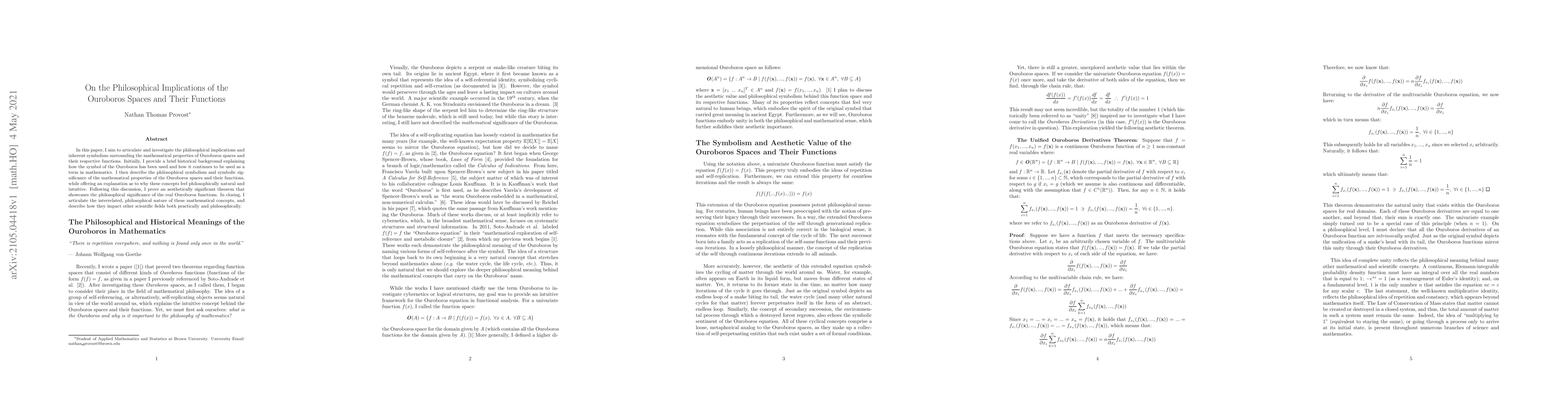 This paper explores the philosophical implications of Ouroboros spaces and their functions, revealing a deep connection between mathematical concepts and intuitive philosophical principles. A significant theorem is proved to showcase the aesthetically pleasing nature of these concepts, impacting various scientific fields both practically and philosophically.