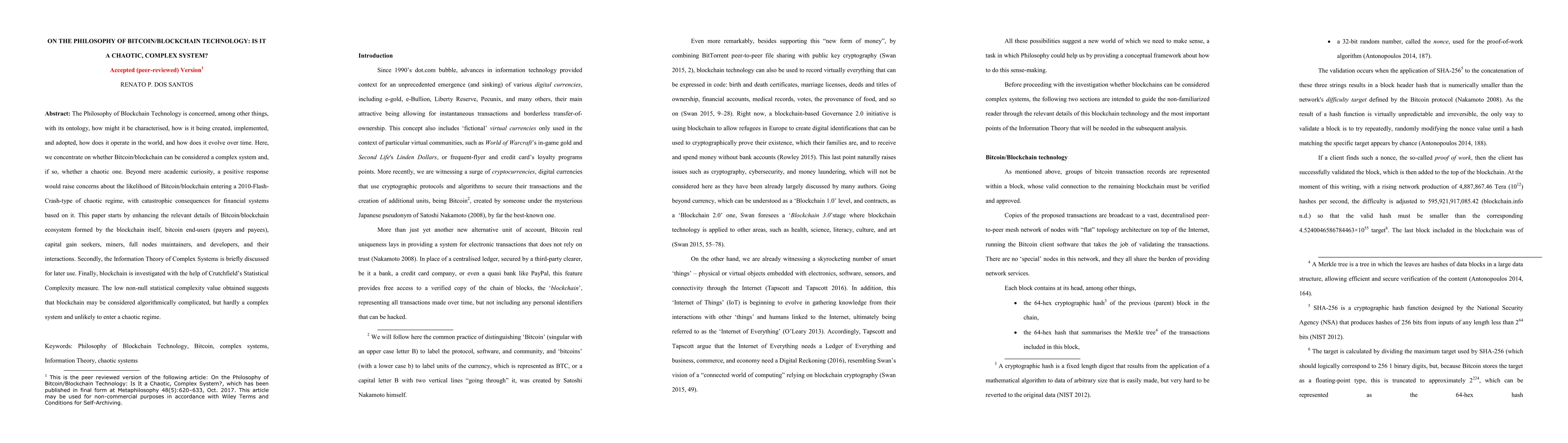 The philosophy of blockchain technology is concerned, among other things, with blockchain ontology, how it might be characterised, how it is being created, implemented, and adopted, how it operates in the world, and how it evolves over time. This paper concentrates on whether Bitcoin/blockchain can be considered a complex system and, if so, whether it is a chaotic one. Beyond mere academic curiosity, a positive response would raise concerns about the likelihood of Bitcoin/blockchain entering a 2010-Flash-Crash-type of chaotic regime, with catastrophic consequences for financial systems based on it. The paper starts by highlighting the relevant details of the Bitcoin/blockchain ecosystem formed by the blockchain itself, bitcoin end users (payers and payees), capital gains seekers, miners, full nodes maintainers, and developers, and their interactions. Then the Information Theory of Complex Systems is briefly discussed for later use. Finally, the blockchain is investigated with the help of Crutchfield's Statistical Complexity measure. The low non-null statistical complexity value obtained suggests that the blockchain may be considered algorithmically complicated but hardly a complex system and unlikely to enter a chaotic regime.