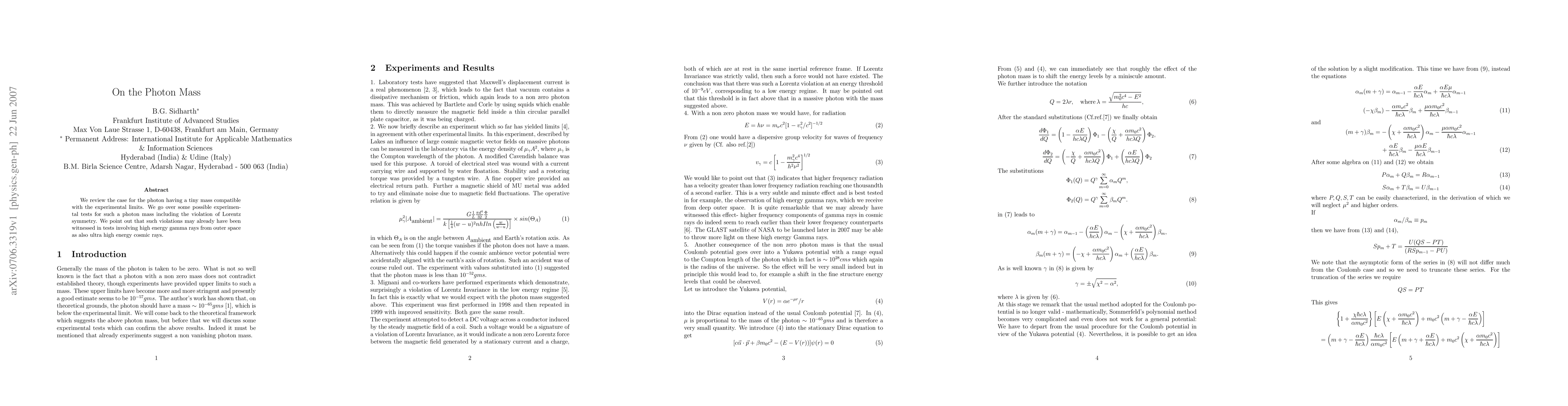 This paper reviews the possibility of photons having a minuscule mass within experimental limits and discusses potential tests for such a mass, including Lorentz symmetry violations, which may have already been observed in high-energy gamma ray and ultra-high energy cosmic ray experiments.
