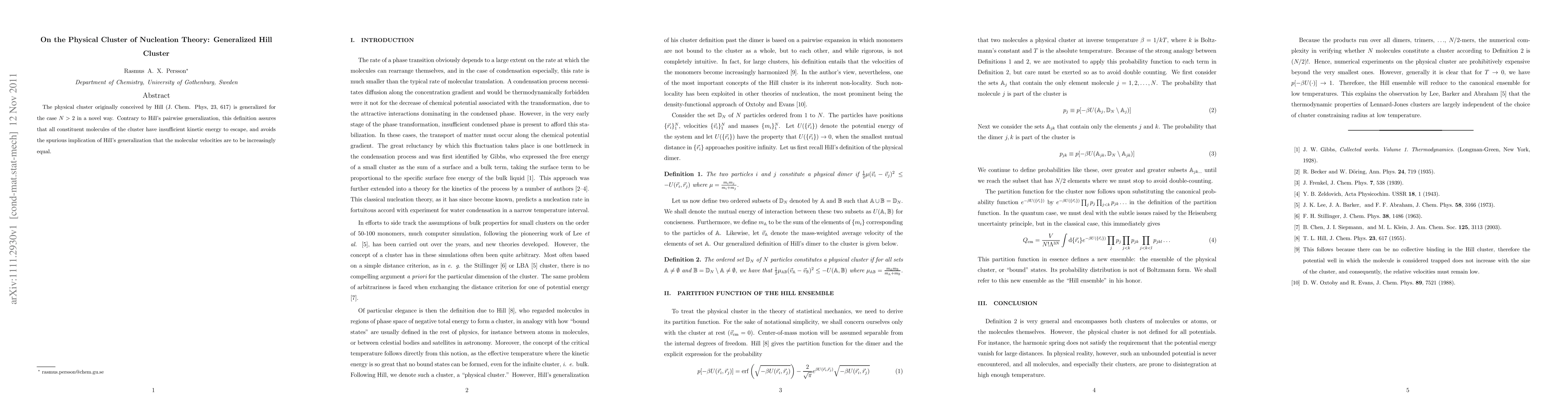 The physical cluster originally conceived by Hill (J. Chem. Phys, 23, 617) is generalized for the case $N > 2$ in a novel way. Contrary to Hill's pairwise generalization, this definition assures that all constituent molecules of the cluster have insufficient kinetic energy to escape, and avoids the spurious implication of Hill's generalization that the molecular velocities are to be increasingly equal.