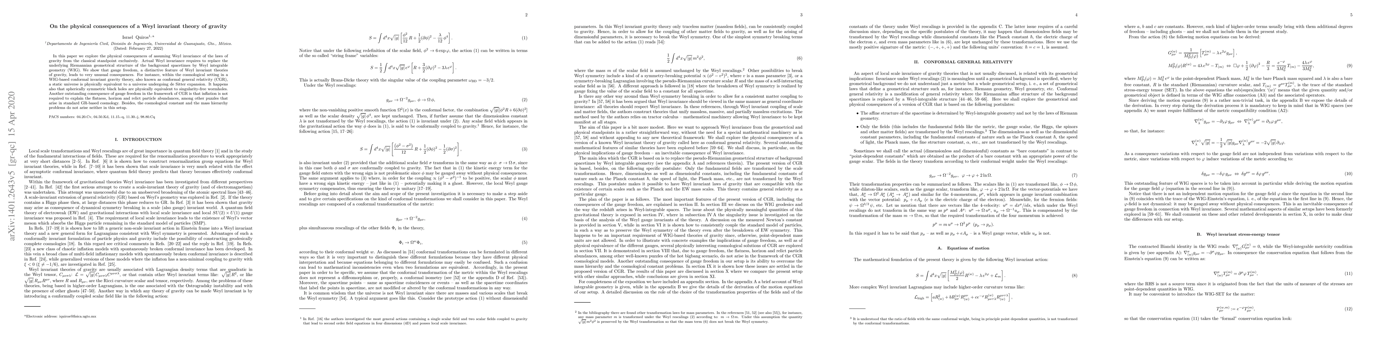 In this paper we explore the physical consequences of assuming Weyl invariance of the laws of gravity from the classical standpoint exclusively. Actual Weyl invariance requires to replace the underlying Riemannian geometrical structure of the background spacetimes by Weyl integrable geometry (WIG). We show that gauge freedom, a distinctive feature of Weyl invariant theories of gravity, leads to very unusual consequences. For instance, within the cosmological setting in a WIG-based conformal invariant gravity theory, also known as conformal general relativity (CGR), a static universe is physically equivalent to a universe undergoing de Sitter expansion. It happens also that spherically symmetric black holes are physically equivalent to singularity-free wormholes. Another outstanding consequence of gauge freedom in the framework of CGR is that inflation is not required to explain the flatness, horizon and relict particle abundances, among other puzzles that arise in standard GR-based cosmology. Besides, the cosmological constant and the mass hierarchy problems do not arise neither in this setup.