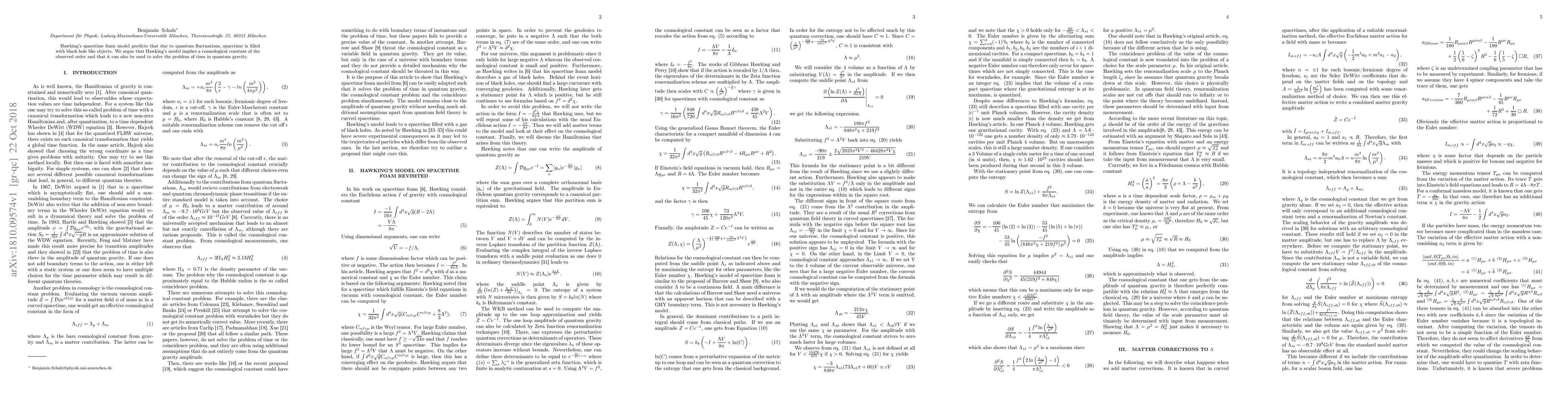 Summary: Hawking's spacetime foam model suggests that quantum fluctuations create black hole-like entities throughout spacetime, potentially explaining the observed cosmological constant and offering a solution to the problem of time in quantum gravity.