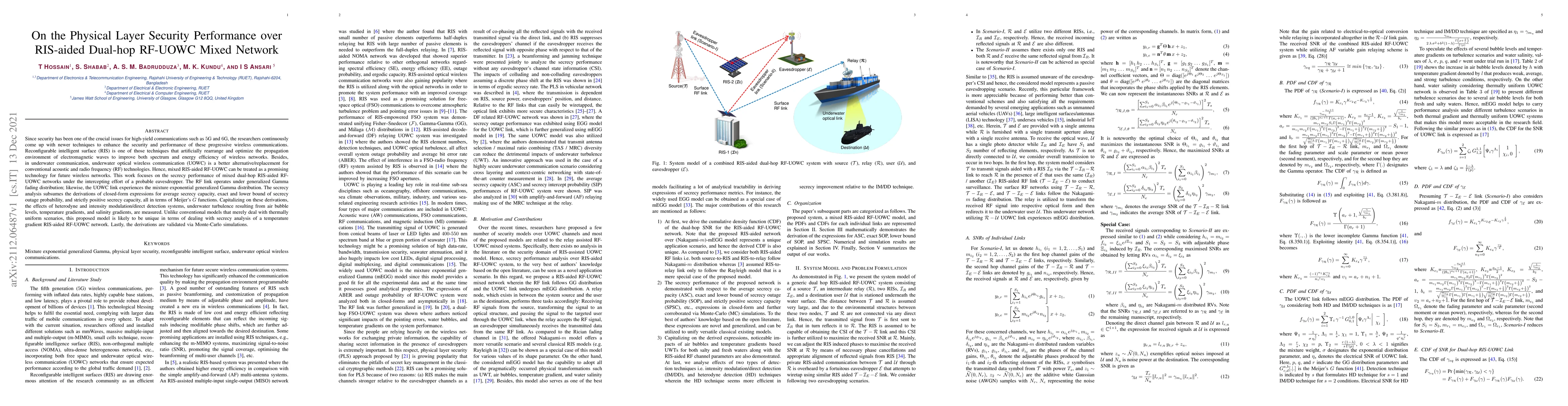 This paper investigates the physical layer security in RIS-aided dual-hop RF-UOWC mixed networks, focusing on average secrecy capacity and secrecy outage probability under various underwater turbulence conditions. It proposes closed-form expressions for these metrics, validated by Monte-Carlo simulations, and considers the impact of heterodyne and IM/DD systems in a non-uniform temperature gradient scenario.