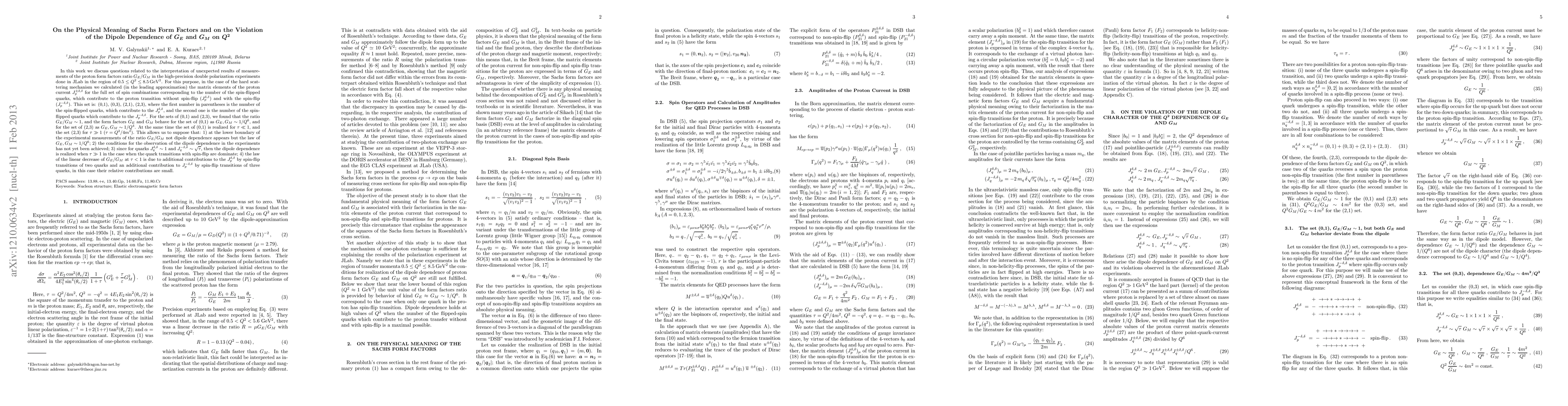 We discuss questions related to the interpretation of unexpected results of measurements of the proton form factors ratio G_E/G_M in the polarization experiments done in JLab in the region of 0.5 < Q^2 < 8.5 GeV^2. For this purpose, in the case of the hard scattering mechanism we calculated (in the leading approximation) the matrix elements of the proton current J^{\pm \delta,\delta}_p for the full set of spin combinations corresponding to the number of the spin-flipped quarks, which contribute to the proton transition without spin-flip (J^{\delta,\delta}_p) and with the spin-flip (J^{-\delta,\delta}_p). This set is: (0,1), (0,3), (2,1), (2,3), where the first number in parentheses is the number of the spin-flipped quarks, which contribute to the J^{\delta,\delta}_p, and the second one is the number of the spin-flipped quarks which contribute to the J^{-\delta,\delta}_p. For the sets of (0,1) and (2,3), we found that the ratio G_E/G_M ~ 1, and the form factors G_E and G_M behave for the set of (0,1) as G_E, G_M ~ 1/Q^6, and for the set of (2,3) as G_E, G_M ~ 1/Q^4. At the same time the set of (0,1) is realized for \tau << 1, and the set (2,3) for \tau >> 1 (\tau=Q^2/4m^2). This allows us to suppose that: 1) at the lower boundary of the experimental measurements of the ratio G_E/G_M not dipole dependence appears but the law of G_E, G_M ~ 1/Q^6; 2) the conditions for the observation of the dipole dependence in the experiments has not yet been achieved; 3) since for quarks J^{\delta,\delta}_q ~ 1 and J^{-\delta,\delta}_q ~ \sqrt{\tau}, then the dipole dependence is realized when \tau >> 1 in the case when the quark transitions with spin-flip are dominate.