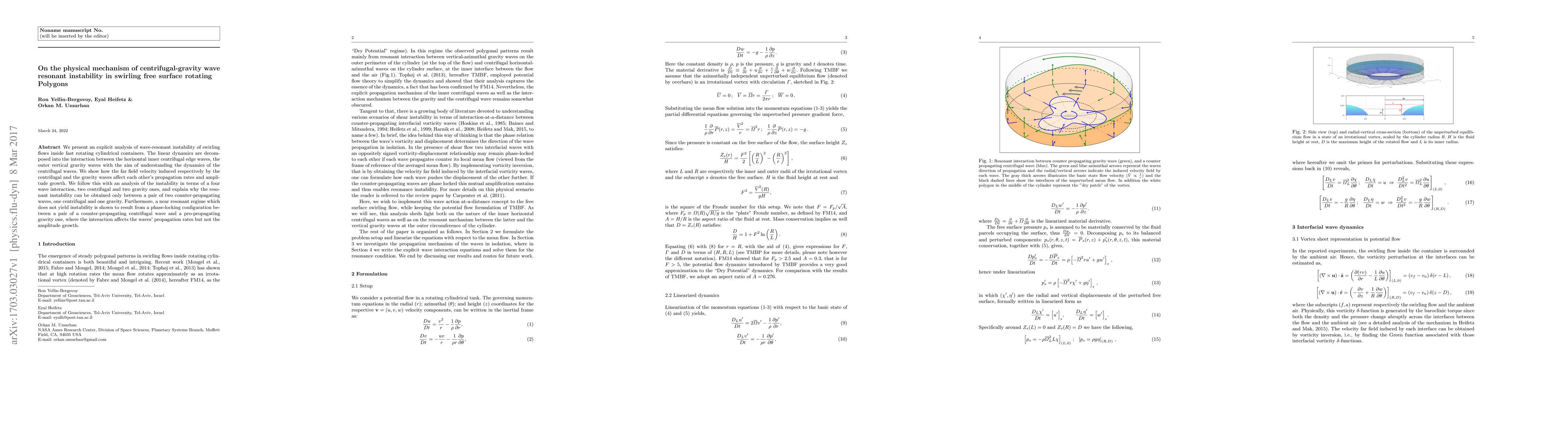 We present an explicit analysis of wave-resonant instability of swirling flows inside fast rotating cylindrical containers. The linear dynamics are decomposed into the interaction between the horizontal inner centrifugal edge waves, the outer vertical gravity waves with the aim of understanding the dynamics of the centrifugal waves. We show how the far field velocity induced respectively by the centrifugal and the gravity waves affect each other's propagation rates and amplitude growth. We follow this with an analysis of the instability in terms of a four wave interaction, two centrifugal and two gravity ones, and explain why the resonant instability can be obtained only between a pair of two counter-propagating waves, one centrifugal and one gravity. Furthermore, a near resonant regime which does not yield instability is shown to result from a phase-locking configuration between a pair of a counter-propagating centrifugal wave and a pro-propagating gravity one, where the interaction affects the waves' propagation rates but not the amplitude growth.