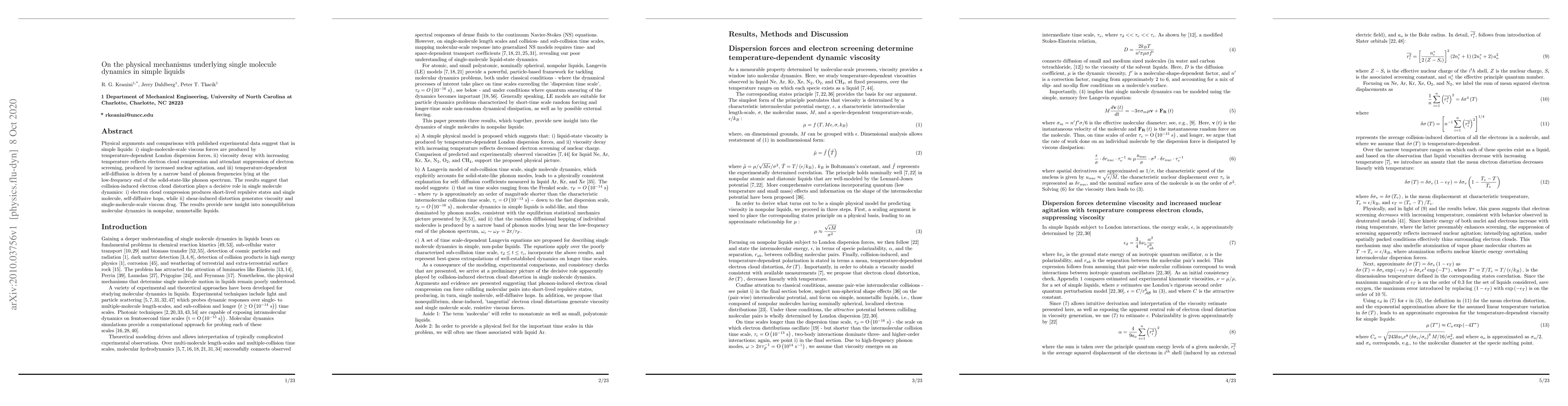 Physical arguments and comparisons with published experimental data suggest that in simple liquids: i) single-molecule-scale viscous forces are produced by temperature-dependent London dispersion forces, ii) viscosity decay with increasing temperature reflects electron cloud compression and attendant suppression of electron screening, produced by increased nuclear agitation, and iii) temperature-dependent self-diffusion is driven by a narrow band of phonon frequencies lying at the low-frequency end of the solid-state-like phonon spectrum. The results suggest that collision-induced electron cloud distortion plays a decisive role in single molecule dynamics: i) electron cloud compression produces short-lived repulsive states and single molecule, self-diffusive hops, while ii) shear-induced distortion generates viscosity and single-molecule-scale viscous drag. The results provide new insight into nonequilibrium molecular dynamics in nonpolar, nonmetallic liquids.