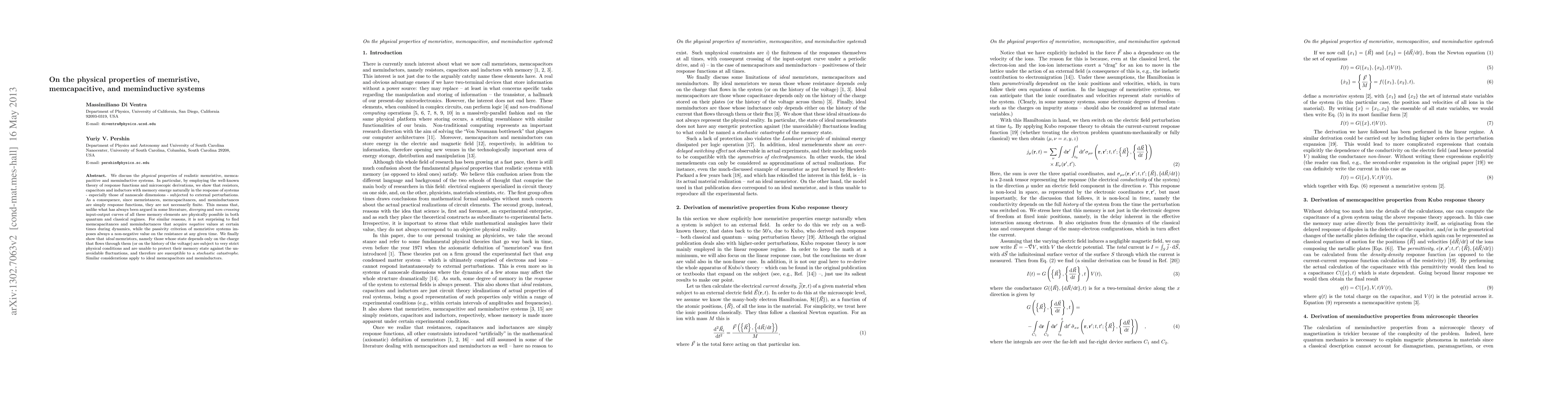 We discuss the physical properties of realistic memristive, memcapacitive and meminductive systems. In particular, by employing the well-known theory of response functions and microscopic derivations, we show that resistors, capacitors and inductors with memory emerge naturally in the response of systems - especially those of nanoscale dimensions - subjected to external perturbations. As a consequence, since memristances, memcapacitances, and meminductances are simply response functions, they are not necessarily finite. This means that, unlike what has always been argued in some literature, diverging and non-crossing input-output curves of all these memory elements are physically possible in both quantum and classical regimes. For similar reasons, it is not surprising to find memcapacitances and meminductances that acquire negative values at certain times during dynamics, while the passivity criterion of memristive systems imposes always a non-negative value on the resistance at any given time. We finally show that ideal memristors, namely those whose state depends only on the charge that flows through them (or on the history of the voltage) are subject to very strict physical conditions and are unable to protect their memory state against the unavoidable fluctuations, and therefore are susceptible to a stochastic catastrophe. Similar considerations apply to ideal memcapacitors and meminductors.