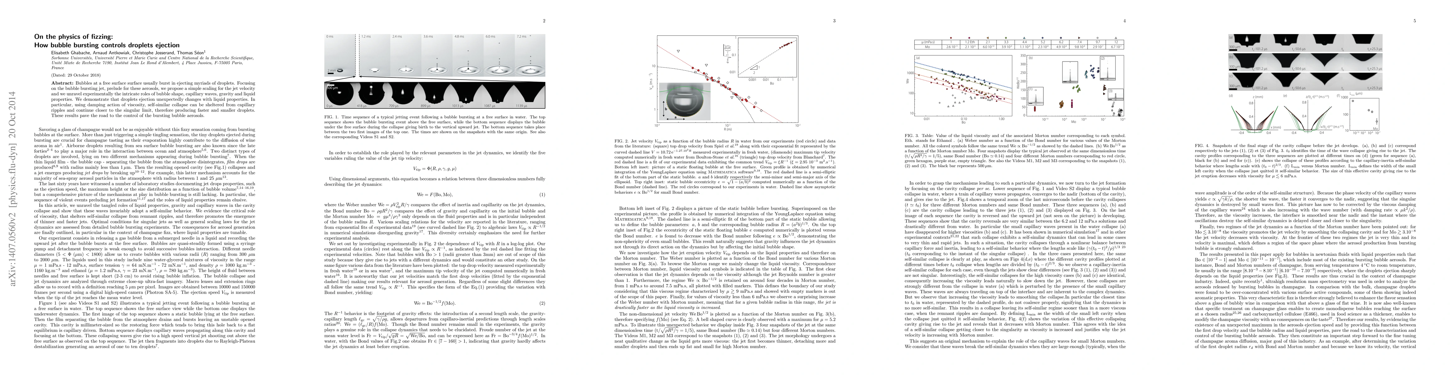 This paper investigates the physics of bubble bursting at free surfaces, proposing a scaling for jet velocity and demonstrating how bubble shape, capillary waves, gravity, and liquid viscosity influence droplet ejection. The study reveals that higher viscosity can lead to faster and smaller droplets by damping capillary waves, offering insights into controlling aerosol production from bursting bubbles.