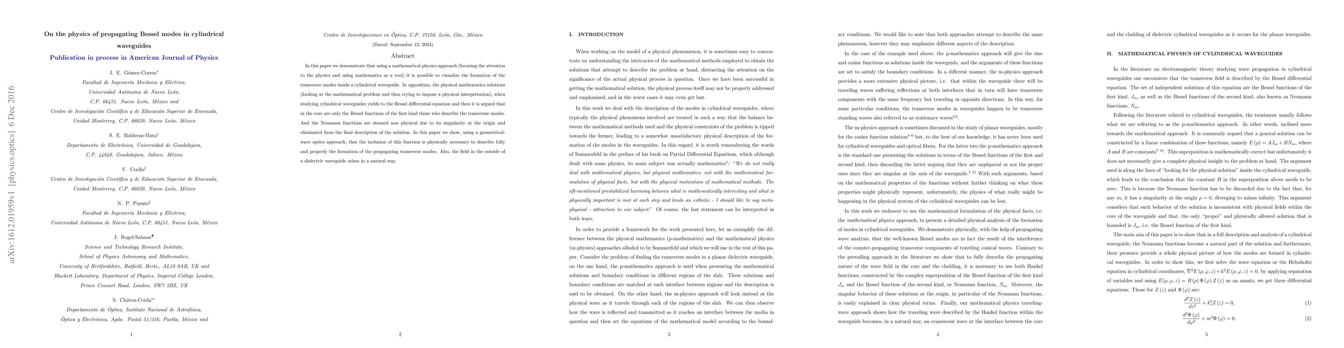 This paper argues that Bessel functions of the first kind alone are insufficient to describe transverse modes in cylindrical waveguides, demonstrating that Neumann functions, despite their singularity, are necessary for a complete physical description. It uses a geometrical-wave optics approach to show the natural emergence of the field outside the dielectric waveguide.