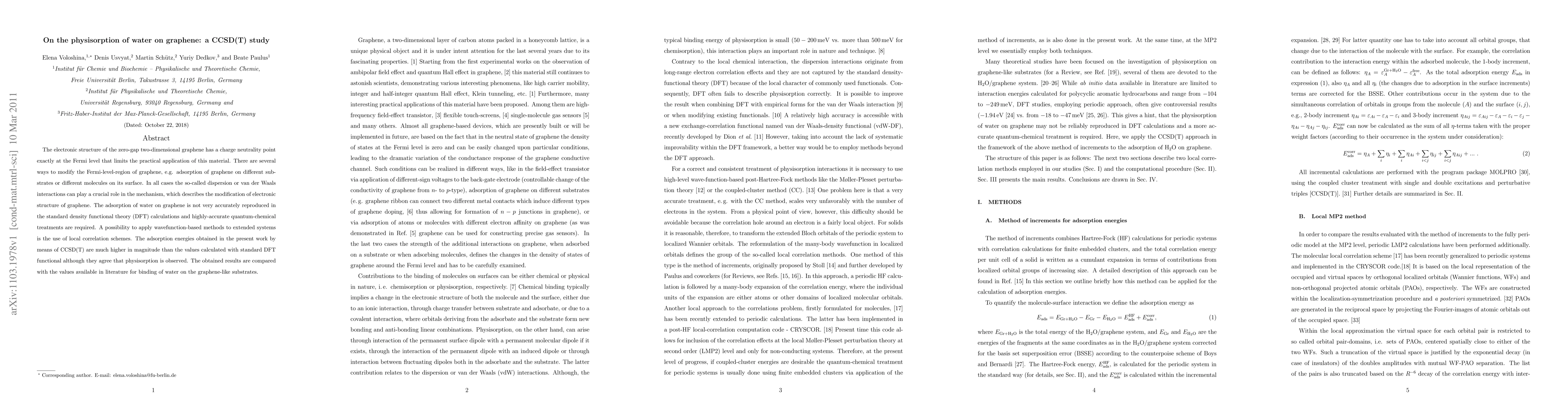 This study uses CCSD(T) to accurately determine the physisorption of water on graphene, finding significantly higher adsorption energies compared to standard DFT calculations, while confirming the presence of physisorption. The results highlight the importance of dispersion interactions in modifying graphene's electronic structure.