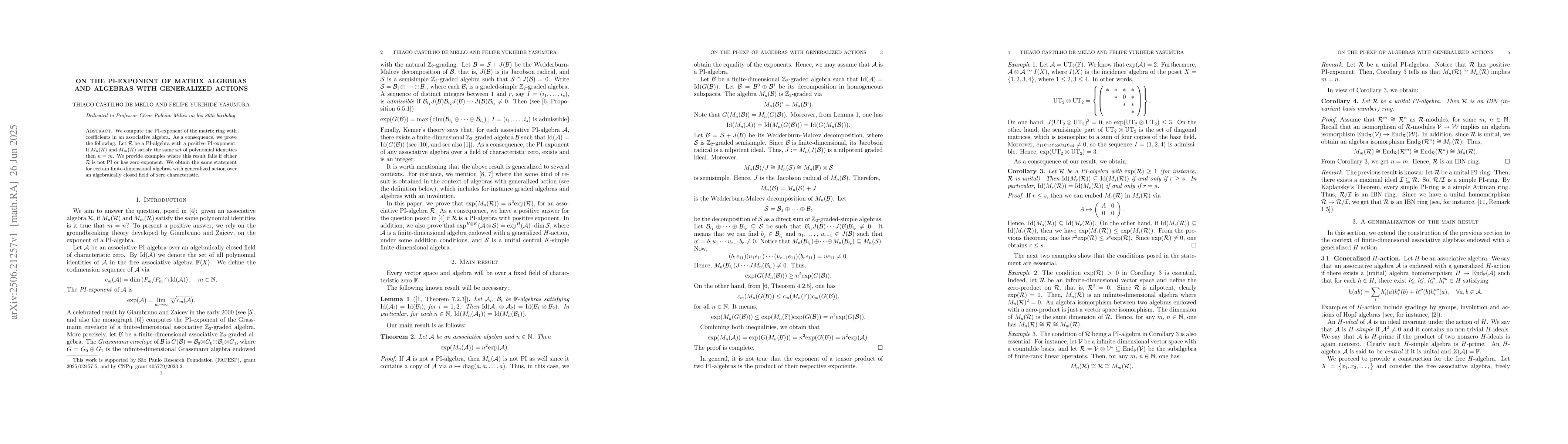 The paper introduces new formulas for the PI-exponent of matrix algebras with coefficients in associative algebras and generalizes the concept to algebras with generalized H-actions, including tensor product and simplicity preservation results.