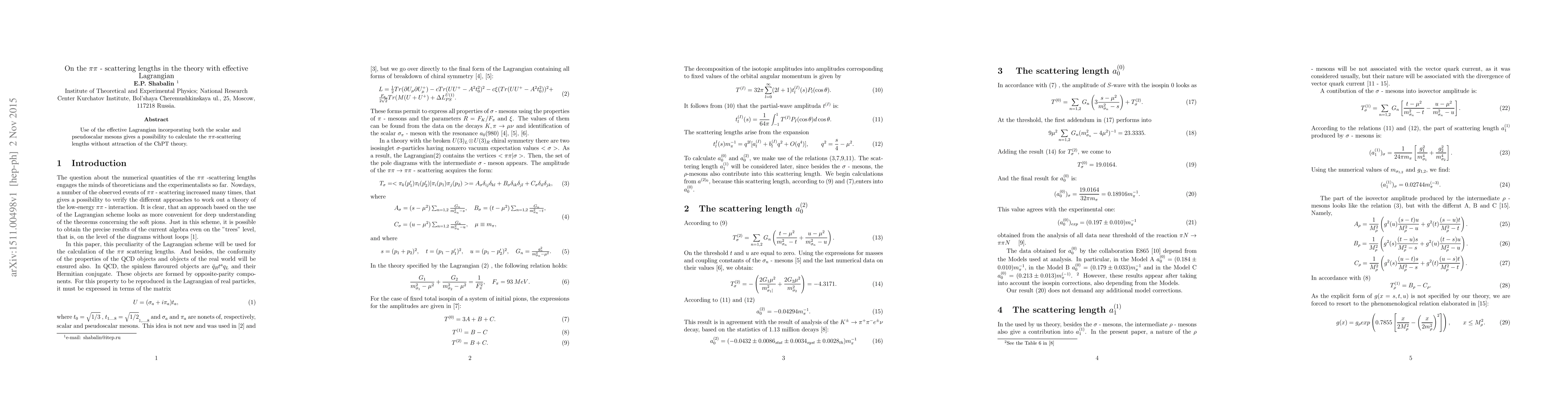 Use of the effective Lagrangian incorporating both the scalar and pseudoscalar mesons gives a possibility to calculate the $\pi \pi$-scattering lengths without attraction of the ChPT theory.