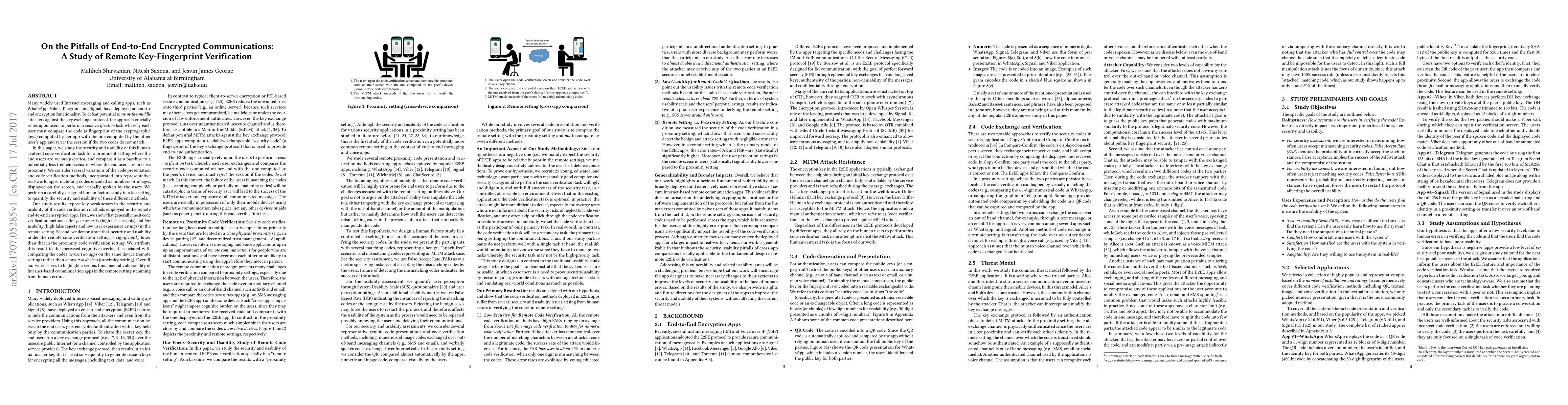 This paper investigates the security and usability of remote code verification in end-to-end encrypted communication apps, finding significant weaknesses in security and usability compared to proximity settings due to increased cognitive load. The study highlights vulnerabilities in Internet-based communication apps stemming from human errors.