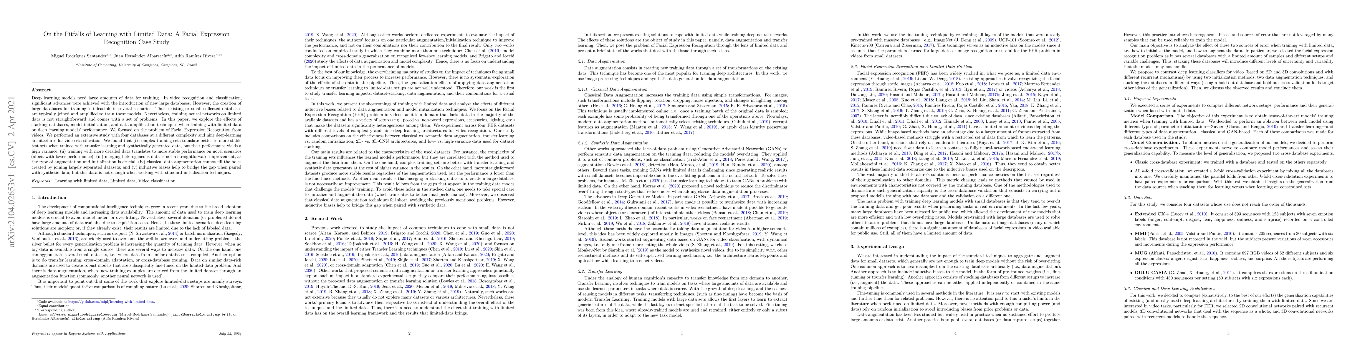 Deep learning models need large amounts of data for training. In video recognition and classification, significant advances were achieved with the introduction of new large databases. However, the creation of large-databases for training is infeasible in several scenarios. Thus, existing or small collected databases are typically joined and amplified to train these models. Nevertheless, training neural networks on limited data is not straightforward and comes with a set of problems. In this paper, we explore the effects of stacking databases, model initialization, and data amplification techniques when training with limited data on deep learning models' performance. We focused on the problem of Facial Expression Recognition from videos. We performed an extensive study with four databases at a different complexity and nine deep-learning architectures for video classification. We found that (i) complex training sets translate better to more stable test sets when trained with transfer learning and synthetically generated data, but their performance yields a high variance; (ii) training with more detailed data translates to more stable performance on novel scenarios (albeit with lower performance); (iii) merging heterogeneous data is not a straightforward improvement, as the type of augmentation and initialization is crucial; (iv) classical data augmentation cannot fill the holes created by joining largely separated datasets; and (v) inductive biases help to bridge the gap when paired with synthetic data, but this data is not enough when working with standard initialization techniques.