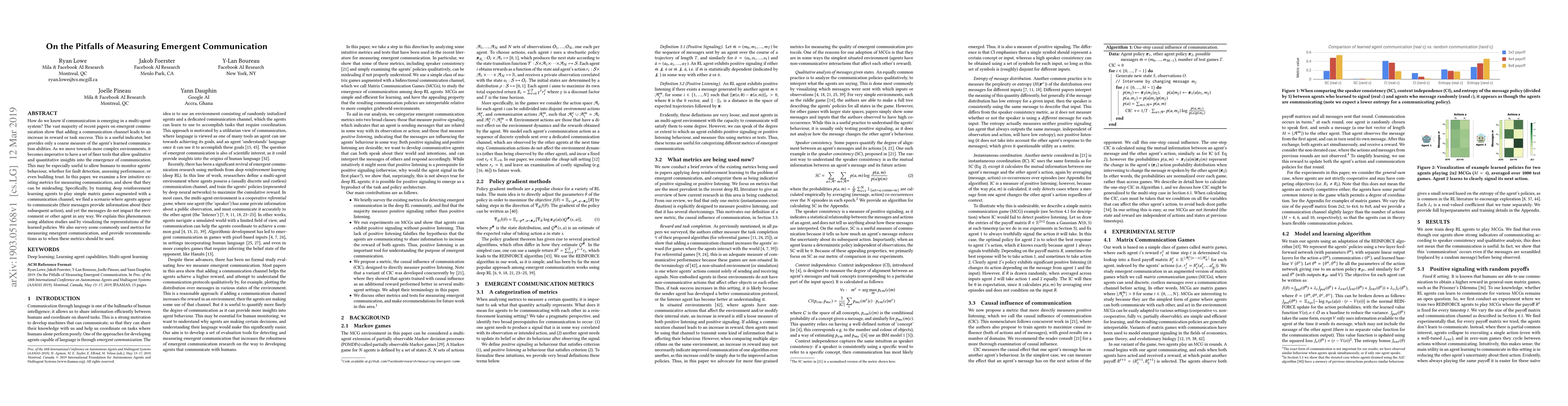 This paper critiques existing metrics for measuring emergent communication in multi-agent systems, demonstrating that while increased reward may indicate communication, it is an insufficient measure. The authors show through experiments that agents can appear to communicate without actual impact, highlighting the need for more nuanced tools to assess communication in complex environments.