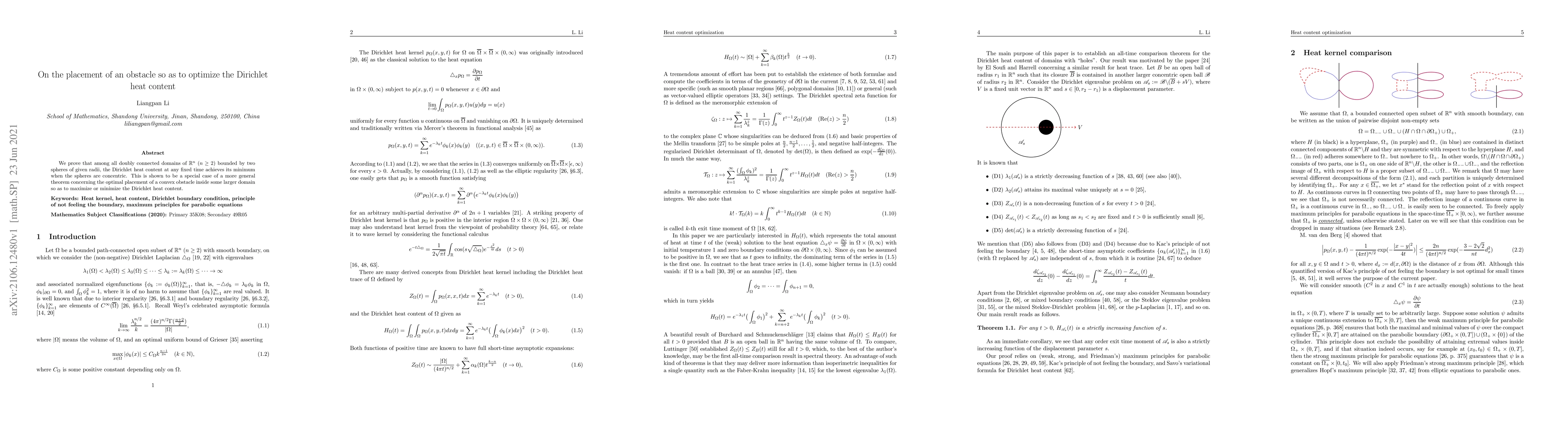 This paper proves that among all doubly connected domains in R^n bounded by two spheres of given radii, the minimum Dirichlet heat content occurs when the spheres are concentric. It also extends this result to the optimal placement of a convex obstacle within a larger domain to achieve optimal Dirichlet heat content.