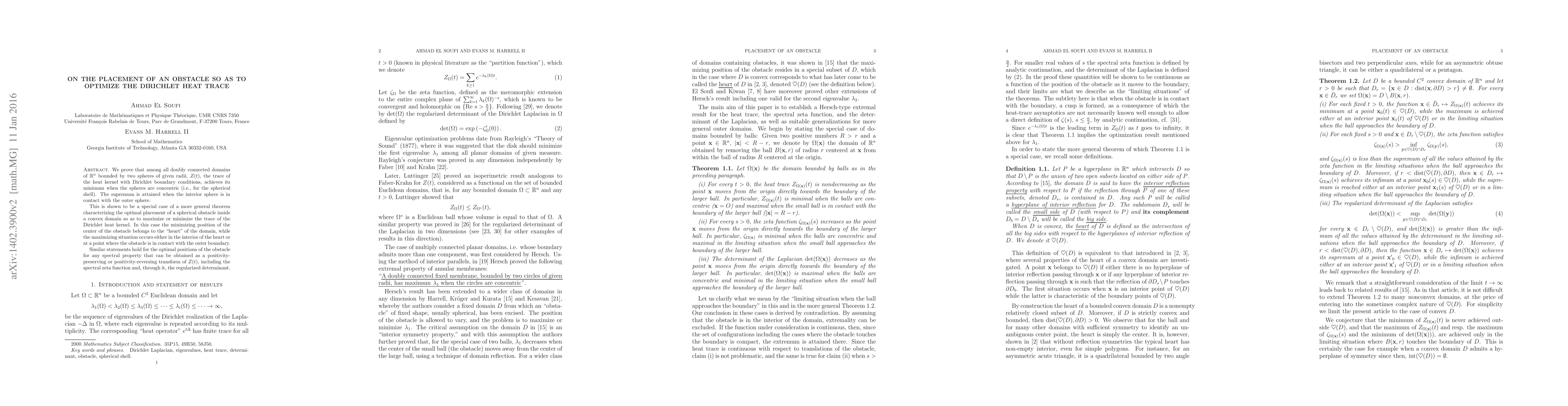 We prove that among all doubly connected domains of $\R^n$ bounded by two spheres of given radii, $Z(t)$, the trace of the heat kernel with Dirichlet boundary conditions, achieves its minimum when the spheres are concentric (i.e., for the spherical shell). The supremum is attained when the interior sphere is in contact with the outer sphere.This is shown to be a special case of a more general theorem characterizing the optimal placement of a spherical obstacle inside a convex domain so as to maximize or minimize the trace of the Dirichlet heat kernel. In this case the minimizing position of the center of the obstacle belongs to the "heart" of the domain, while the maximizing situation occurs either in the interior of the heart or at a point where the obstacle is in contact with the outer boundary. Similar statements hold for the optimal positions of the obstaclefor any spectral property that can be obtained as a positivity-preserving or positivity-reversing transform of $Z(t)$,including the spectral zeta function and, through it, the regularized determinant.