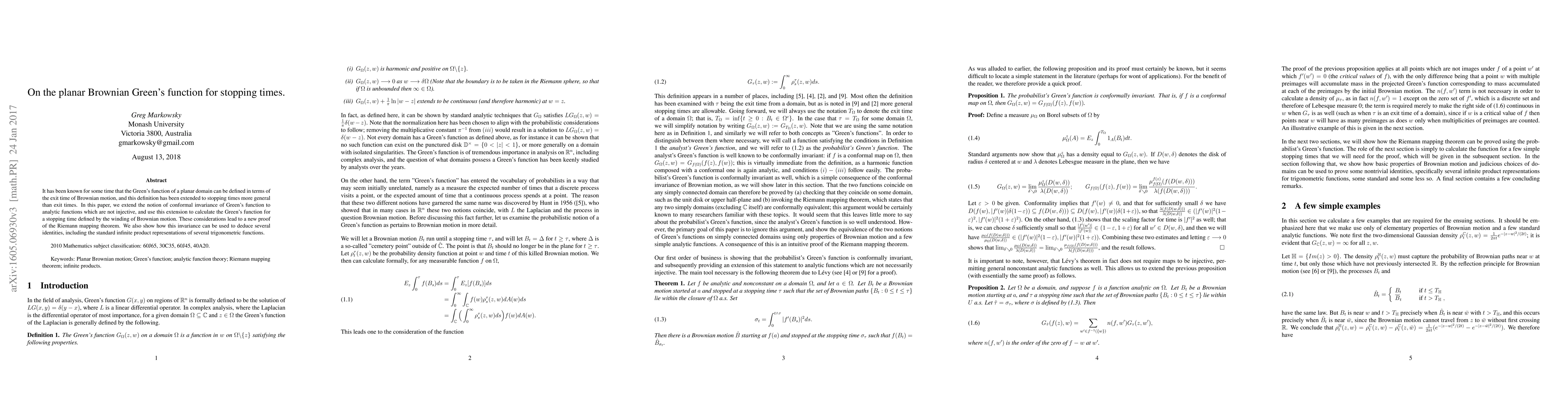 It has been known for some time that the Green's function of a planar domain can be defined in terms of the exit time of Brownian motion, and this definition has been extended to stopping times more general than exit times. In this paper, we extend the notion of conformal invariance of Green's function to analytic functions which are not injective, and use this extension to calculate the Green's function for a stopping time defined by the winding of Brownian motion. These considerations lead to a new proof of the Riemann mapping theorem. We also show how this invariance can be used to deduce several identities, including the standard infinite product representations of several trigonometric functions.