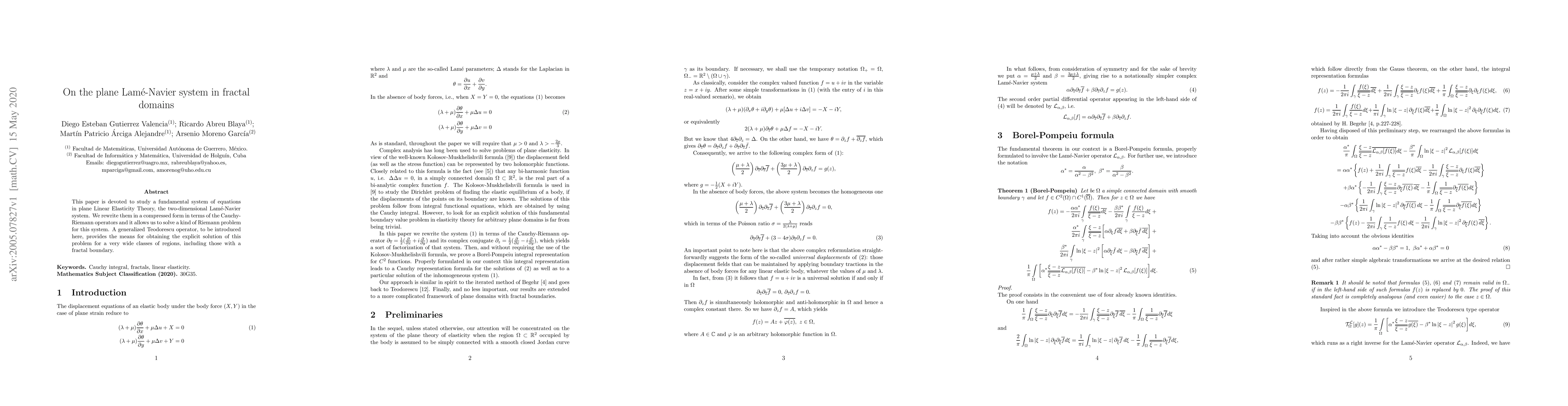 This paper is devoted to study a fundamental system of equations in plane Linear Elasticity Theory, the two-dimensional Lam\'e-Navier system. We rewrite them in a compressed form in terms of the Cauchy-Riemann operators and it allows us to solve a kind of Riemann problem for this system. A generalized Teodorescu operator, to be introduced here, provides the means for obtaining the explicit solution of this problem for a very wide classes of regions, including those with a fractal boundary.