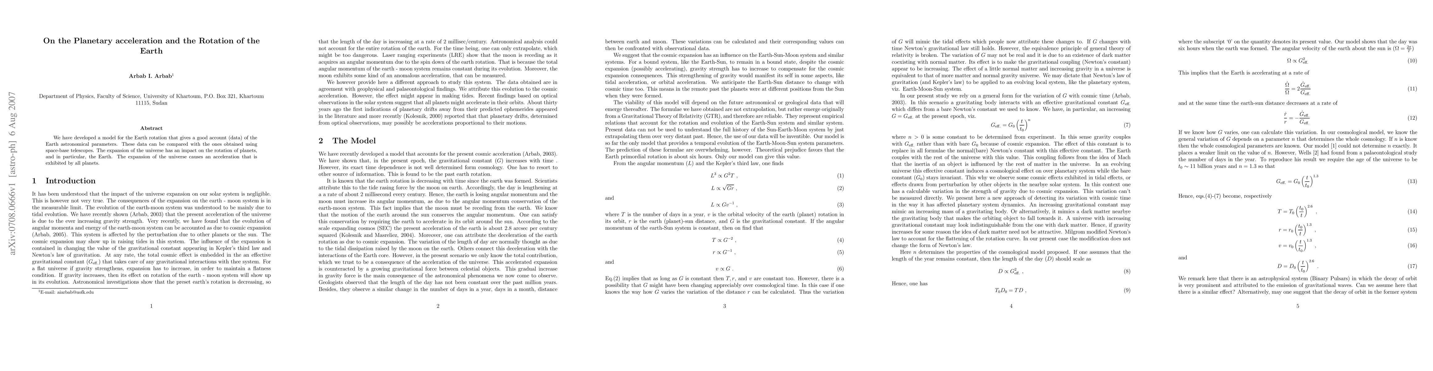 We have developed a model for the Earth rotation that gives a good account (data) of the Earth astronomical parameters. These data can be compared with the ones obtained using space-base telescopes. The expansion of the universe has an impact on the rotation of planets, and in particular, the Earth. The expansion of the universe causes an acceleration that is exhibited by all planets.