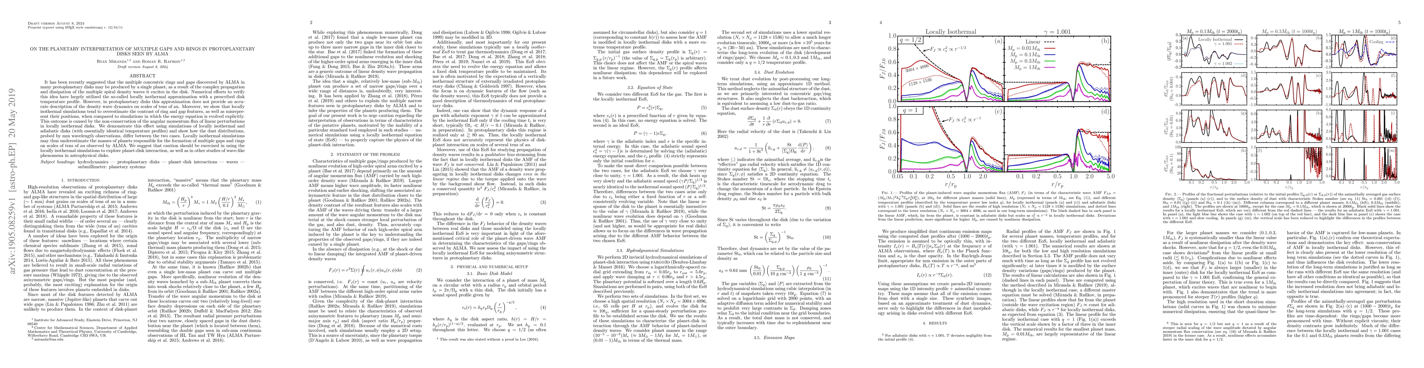 It has been recently suggested that the multiple concentric rings and gaps discovered by ALMA in many protoplanetary disks may be produced by a single planet, as a result of the complex propagation and dissipation of the multiple spiral density waves it excites in the disk. Numerical efforts to verify this idea have largely utilized the so-called locally isothermal approximation with a prescribed disk temperature profile. However, in protoplanetary disks this approximation does not provide an accurate description of the density wave dynamics on scales of tens of au. Moreover, we show that locally isothermal simulations tend to overestimate the contrast of ring and gap features, as well as misrepresent their positions, when compared to simulations in which the energy equation is evolved explicitly. This outcome is caused by the non-conservation of the angular momentum flux of linear perturbations in locally isothermal disks. We demonstrate this effect using simulations of locally isothermal and adiabatic disks (with essentially identical temperature profiles) and show how the dust distributions, probed by mm wavelength observations, differ between the two cases. Locally isothermal simulations may thus underestimate the masses of planets responsible for the formation of multiple gaps and rings on scales of tens of au observed by ALMA. We suggest that caution should be exercised in using the locally isothermal simulations to explore planet-disk interaction, as well as in other studies of wave-like phenomena in astrophysical disks.