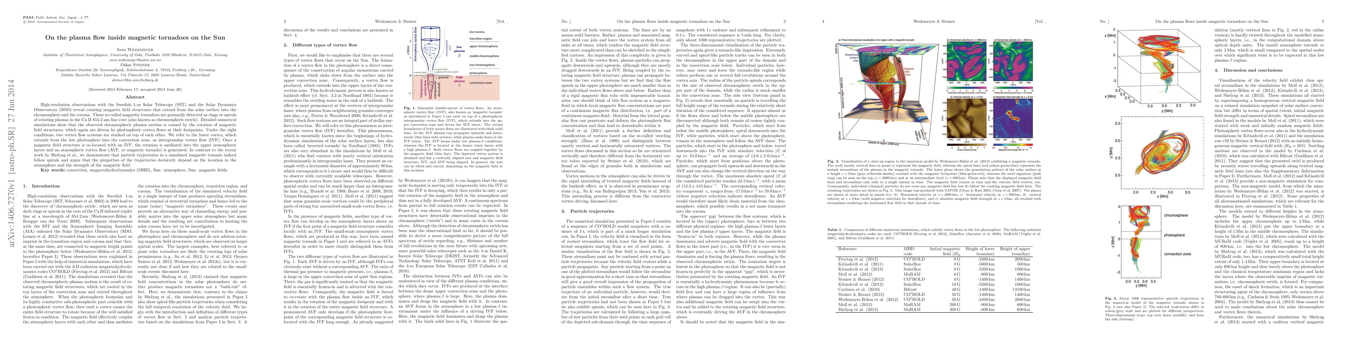 High-resolution observations with the Swedish 1-m Solar Telescope (SST) and the Solar Dynamics Observatory (SDO) reveal rotating magnetic field structures that extend from the solar surface into the chromosphere and the corona. These so-called magnetic tornadoes are primarily detected as rings or spirals of rotating plasma in the Ca II 854.2 nm line core (also known as chromospheric swirls). Detailed numerical simulations show that the observed chromospheric plasma motion is caused by the rotation of magnetic field structures, which again are driven by photospheric vortex flows at their footpoints. Under the right conditions, two vortex flow systems are stacked on top of each other. We refer to the lower vortex, which extends from the low photosphere into the convection zone, as intergranular vortex flow (IVF). Once a magnetic field structure is co-located with an IVF, the rotation is mediated into the upper atmospheric layers and an atmospheric vortex flow (AVF, or magnetic tornado) is generated. In contrast to the recent work by Shelyag et al., we demonstrate that particle trajectories in a simulated magnetic tornado indeed follow spirals and argue that the properties of the trajectories decisively depend on the location in the atmosphere and the strength of the magnetic field.