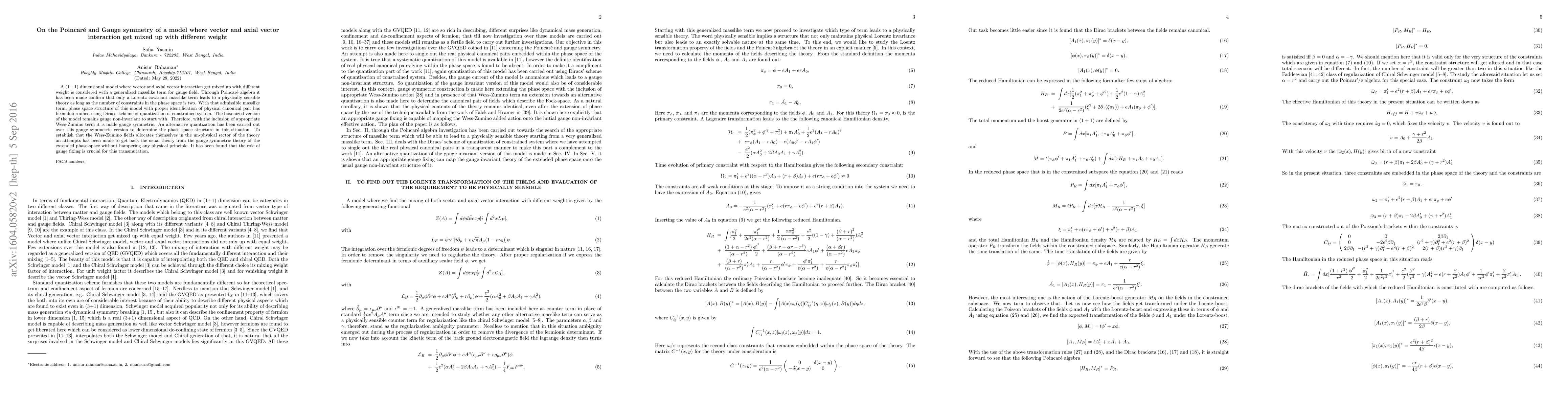 A $(1+1)$ dimensional model where vector and axial vector interaction get mixed up with different weight is considered with a generalized masslike term for gauge field. Through Poincar\'e algebra it has been made confirm that only a Lorentz covariant masslike term leads to a physically sensible theory as long as the number of constraints in the phase space is two. With that admissible masslike term, phase space structure of this model with proper identification of physical canonical pair has been determined using Diracs' scheme of quantization of constrained system. The bosonized version of the model remains gauge non-invariant to start with. Therefore, with the inclusion of appropriate Wess-Zumino term it is made gauge symmetric. An alternative quantization has been carried out over this gauge symmetric version to determine the phase space structure in this situation. To establish that the Wess-Zumino fields allocates themselves in the un-physical sector of the theory an attempts has been made to get back the usual theory from the gauge symmetric theory of the extended phase-space without hampering any physical principle. It has been found that the role of gauge fixing is crucial for this transmutation.