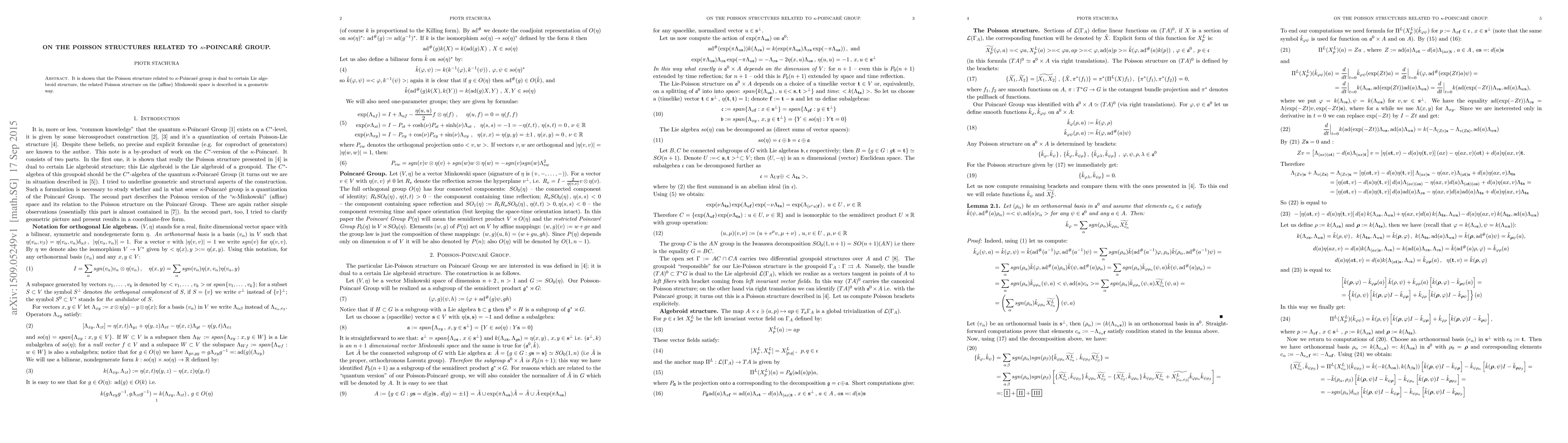 It is shown that the Poisson structure related to $\kappa$-Poincar\'e group is dual to a certain Lie algebroid structure, the related Poisson structure on the (affine) Minkowski space is described in a geometric way.